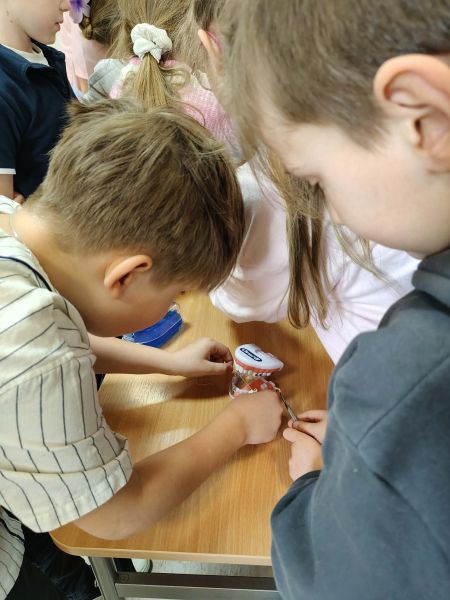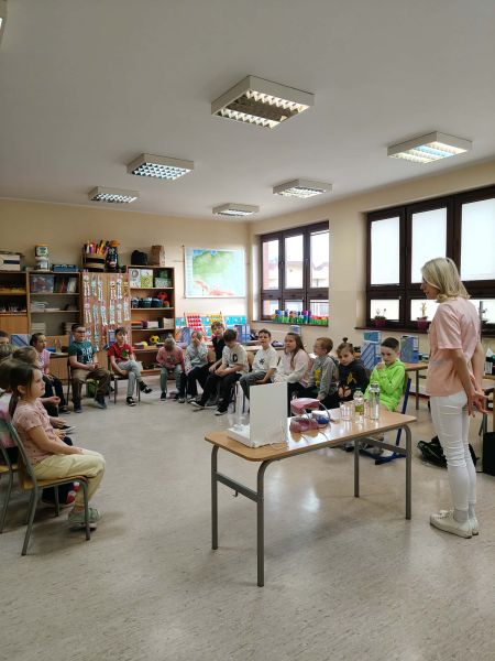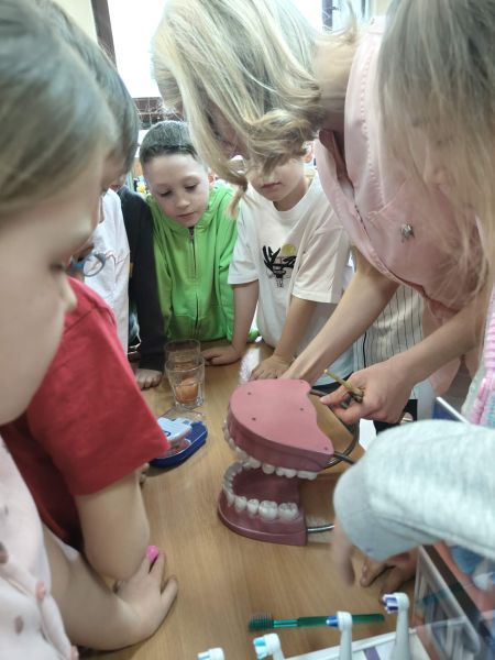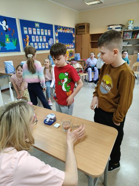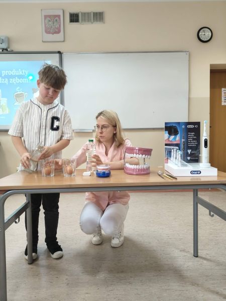 Każde dziecko mogło samodzielnie poćwiczyć tę umiejętność na specjalnym modelu. Dużym zainteresowaniem cieszyło się również doświadczenie pokazujące, jak kwaśne produkty wpływają na nasze zęby – dzieci zaobserwowały, że mogą one osłabiać szkliwo. Korzystając ze zdobytej wiedzy oraz wcześniejszych doświadczeń, uczniowie wspólnie segregowali produkty spożywcze na te, które sprzyjają zdrowiu zębów, oraz te, które mogą im szkodzić. Na zakończenie spotkania każde dziecko otrzymało pamiątkowe lusterko, aby móc dokładnie przyglądać się swoim zębom i jeszcze lepiej o nie dbać. Pani Wiktoria dołączyła do grona ekspertów zawodowych klasy 2C. Był to niezwykle wartościowy i ciekawy czas, który nie tylko poszerzył wiedzę dzieci, ale także uświadomił im, jak ważna jest codzienna higiena jamy ustnej i zdrowe nawyki żywieniowe.