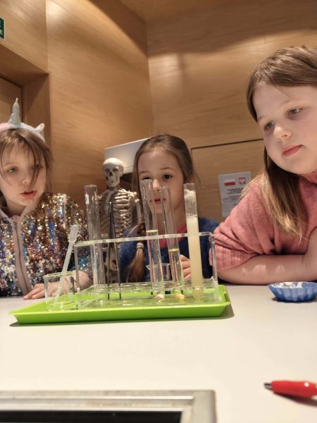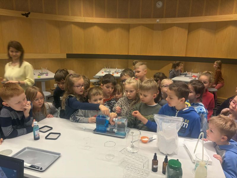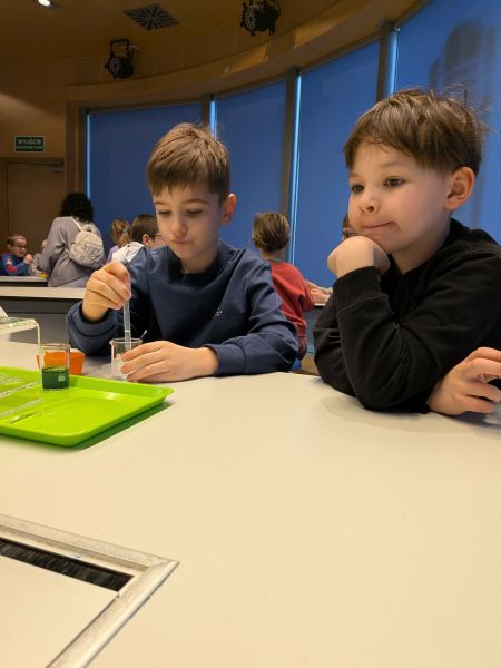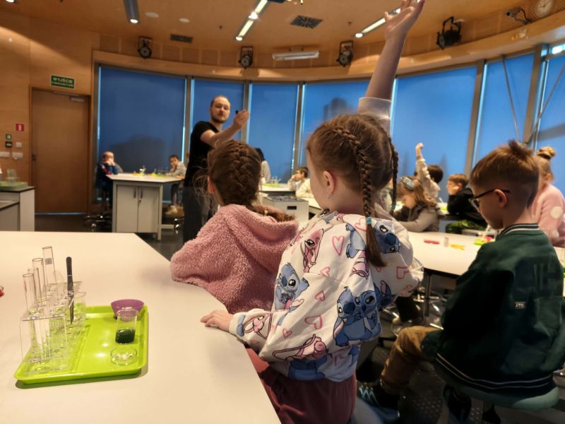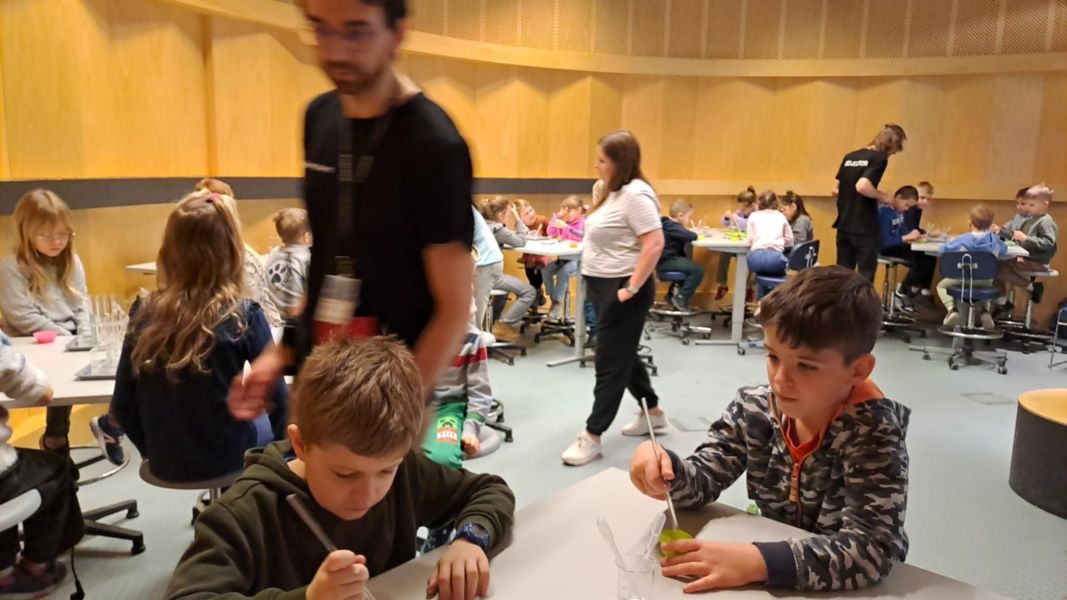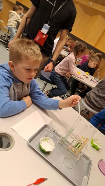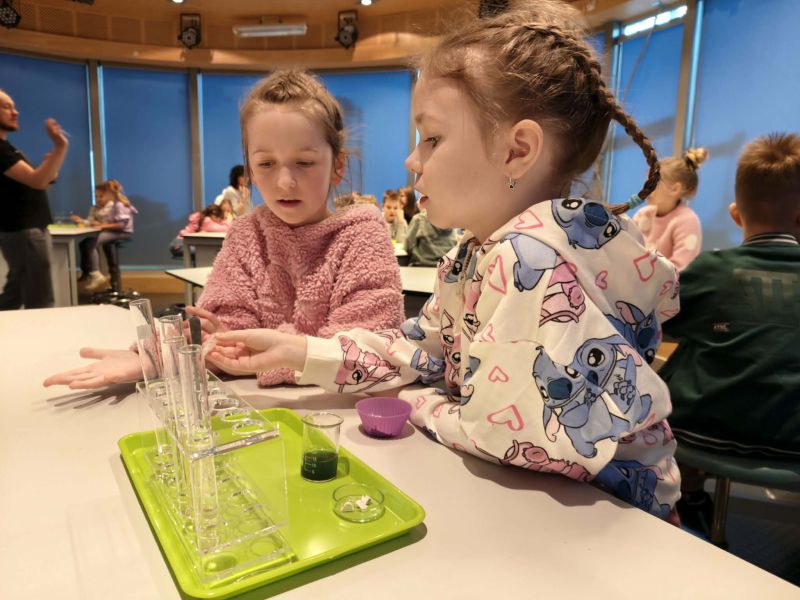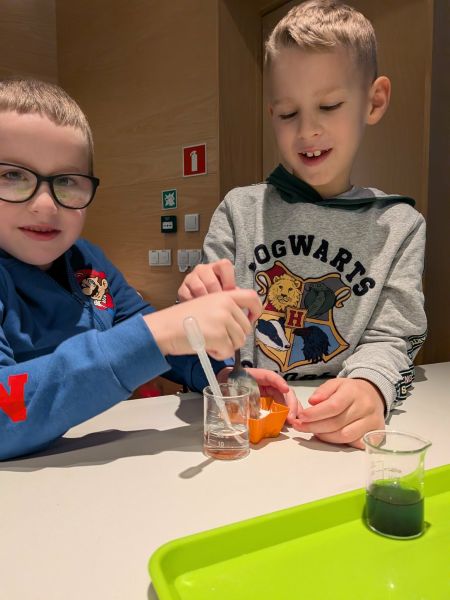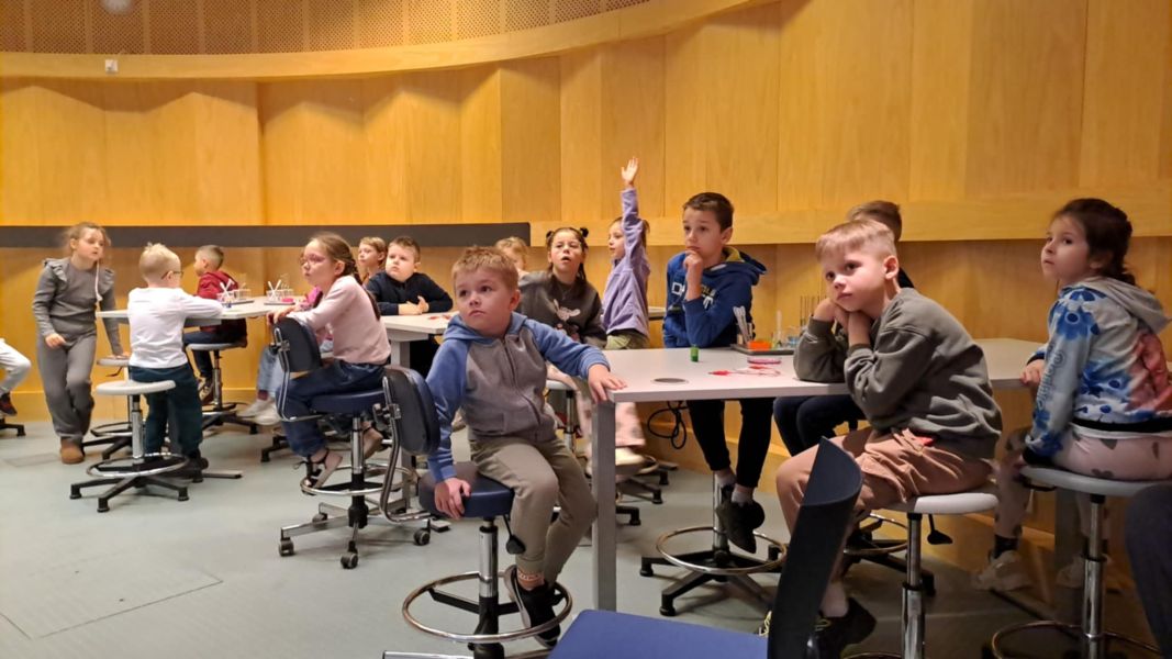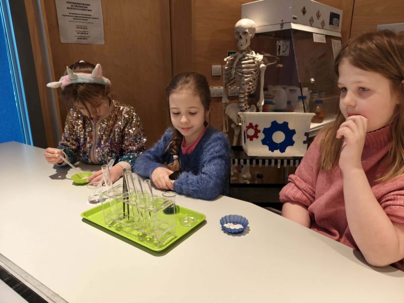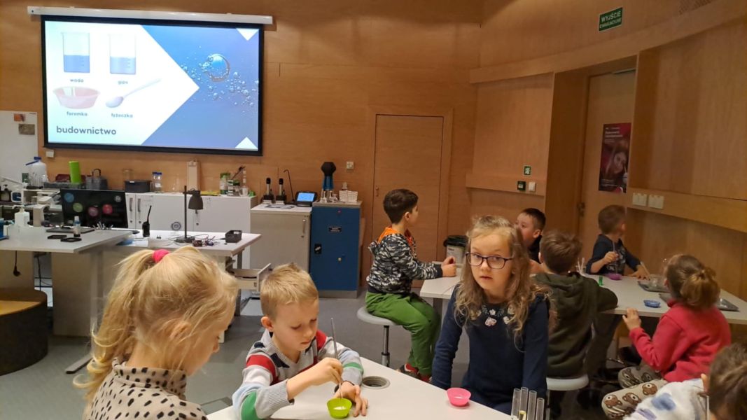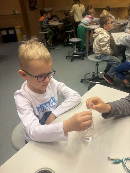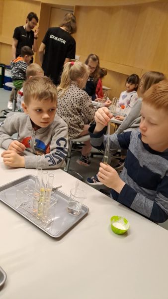 Uczniowie chętnie odpowiadali na pytania edukatorów i z dużym zaangażowaniem przeprowadzali proste reakcje w expowym laboratorium. Ponadto pierwszaki spędziły aktywnie czas na poznawaniu eksponatów gdyńskiego centrum i twórczym eksperymentowaniu. To było niezwykle radosne przedpołudnie!