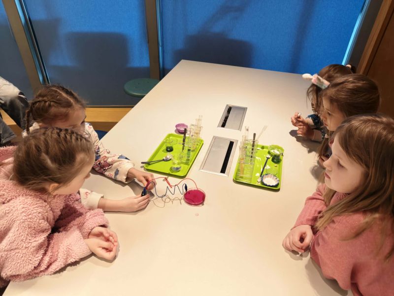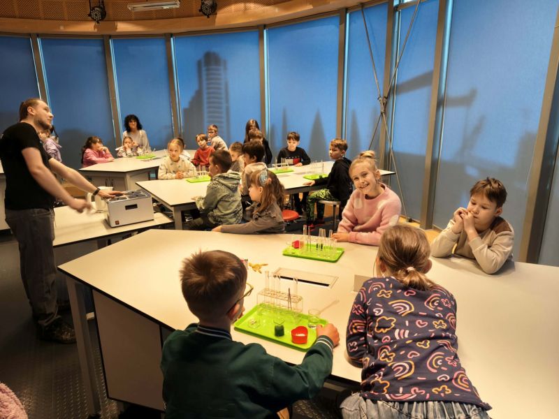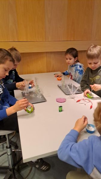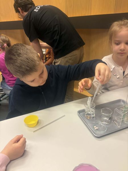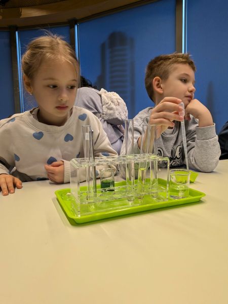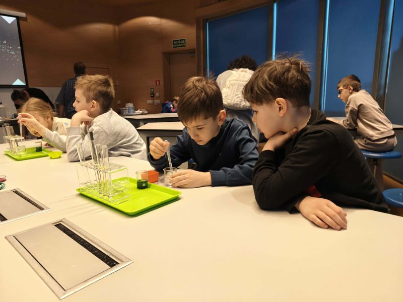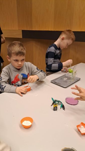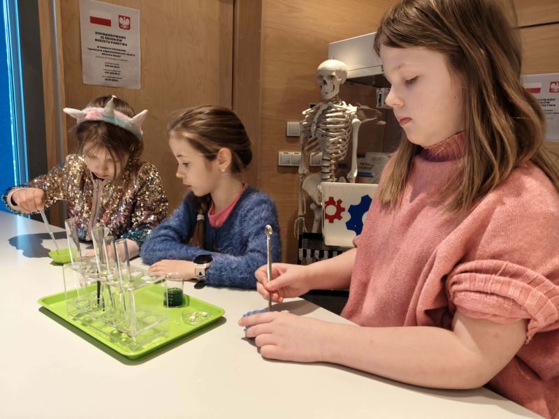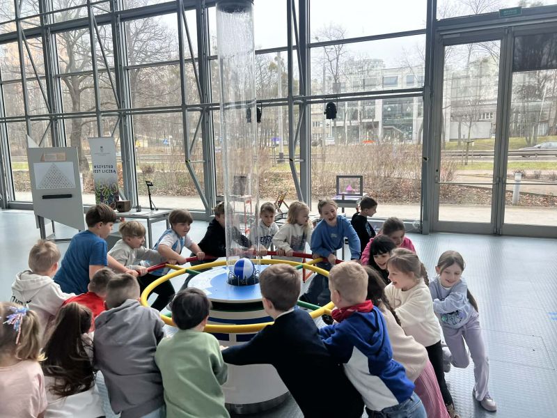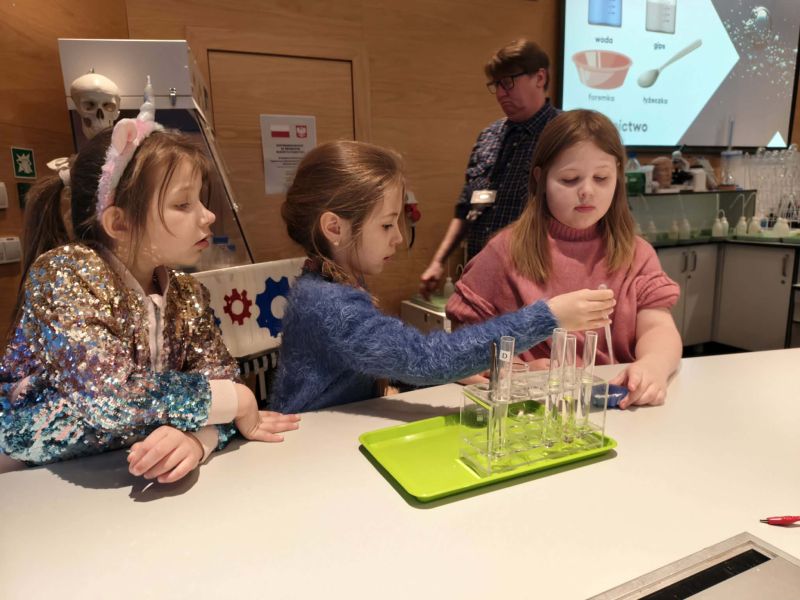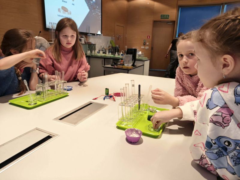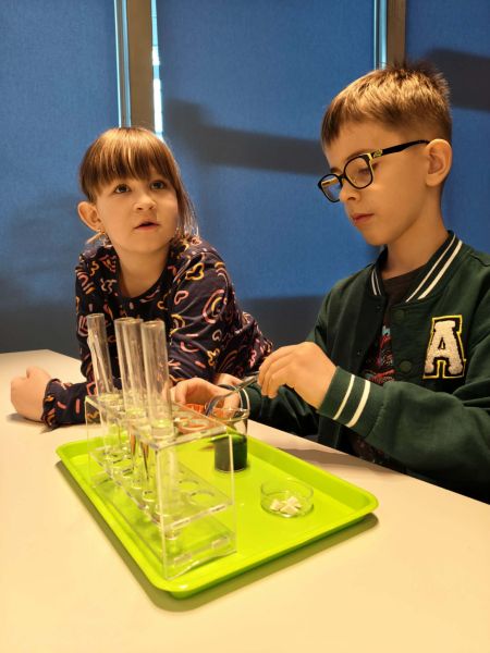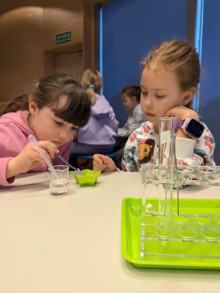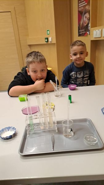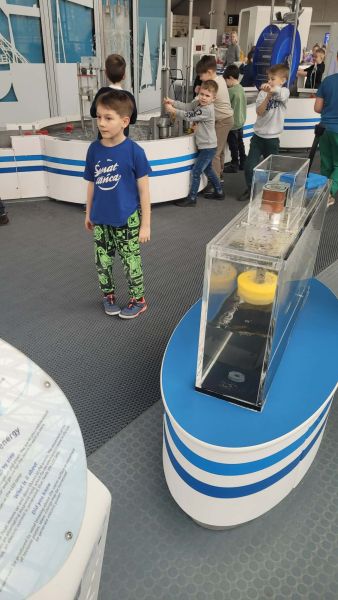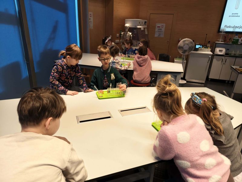 Uczniowie chętnie odpowiadali na pytania edukatorów i z dużym zaangażowaniem przeprowadzali proste reakcje w expowym laboratorium. Ponadto pierwszaki spędziły aktywnie czas na poznawaniu eksponatów gdyńskiego centrum i twórczym eksperymentowaniu. To było niezwykle radosne przedpołudnie!
