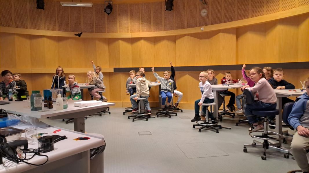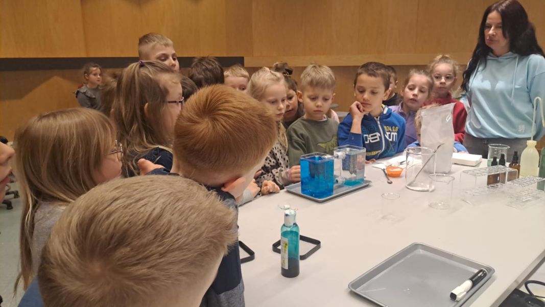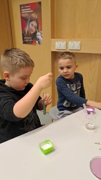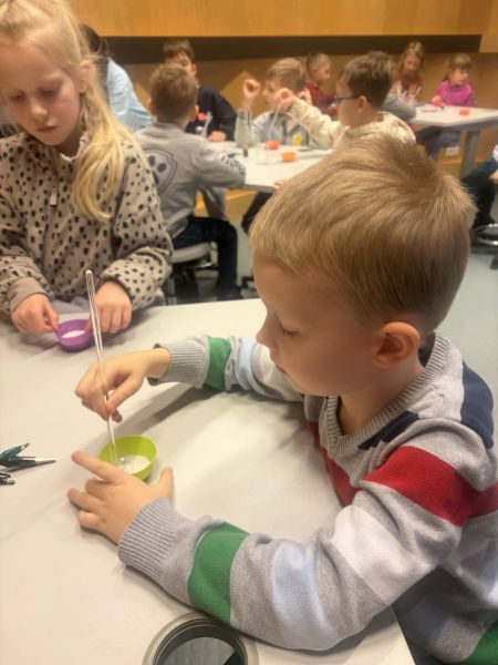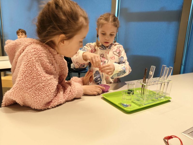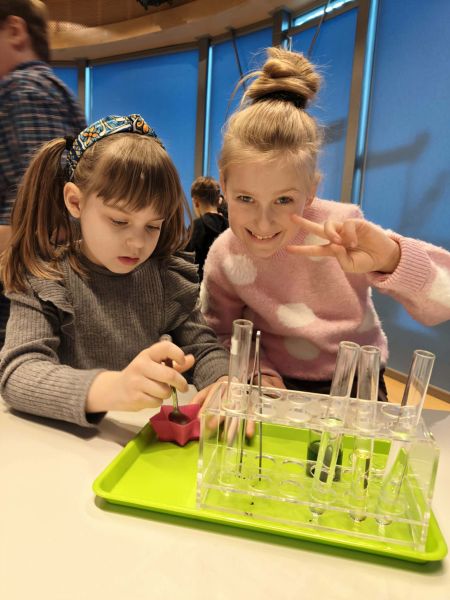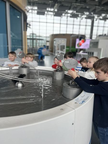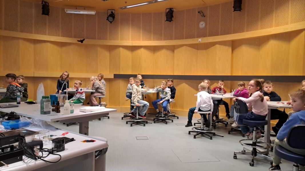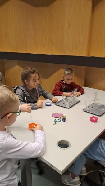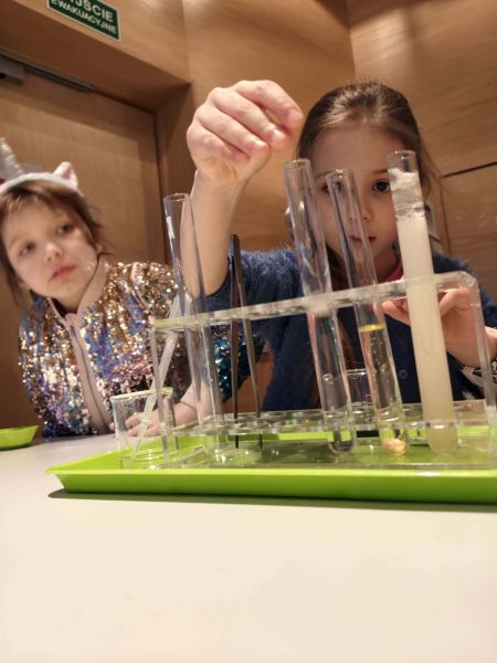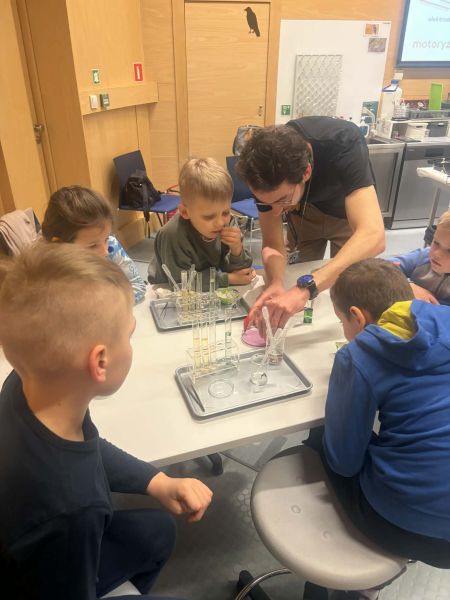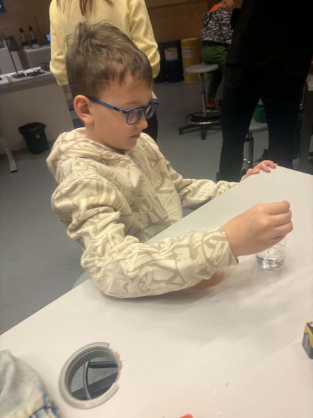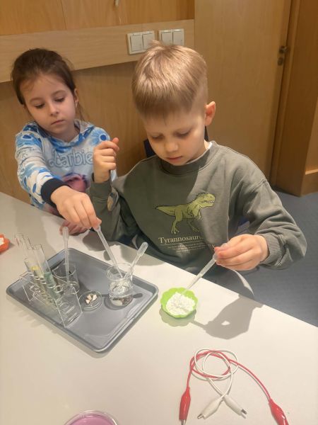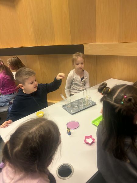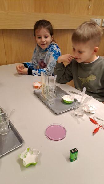 Uczniowie chętnie odpowiadali na pytania edukatorów i z dużym zaangażowaniem przeprowadzali proste reakcje w expowym laboratorium. Ponadto pierwszaki spędziły aktywnie czas na poznawaniu eksponatów gdyńskiego centrum i twórczym eksperymentowaniu. To było niezwykle radosne przedpołudnie!
