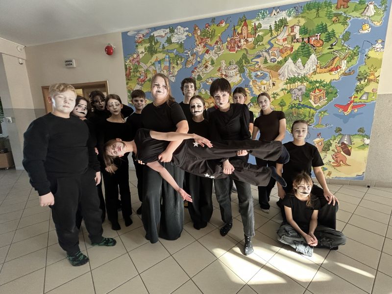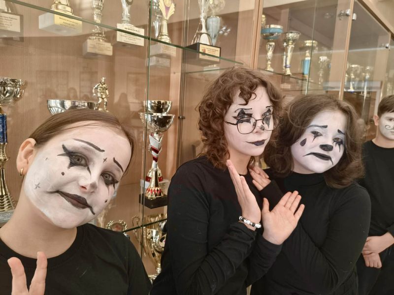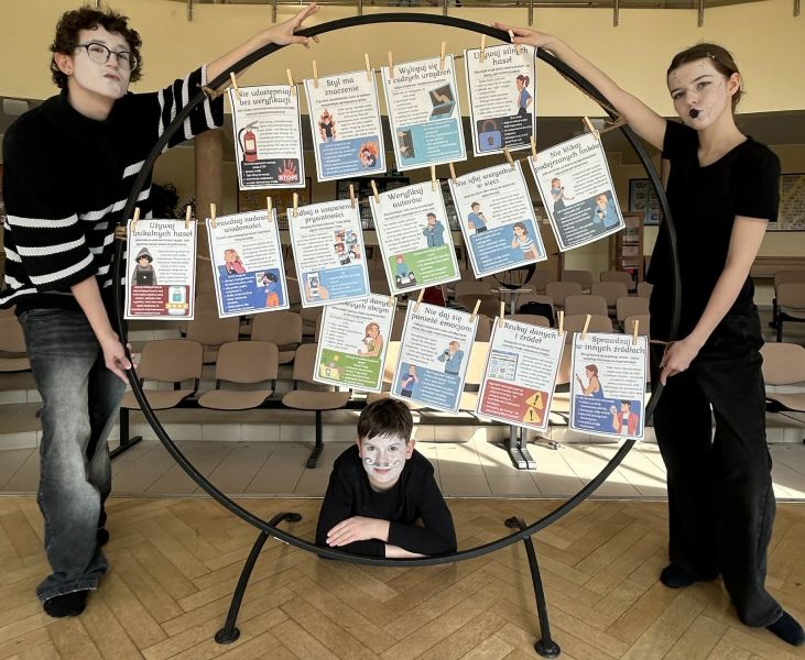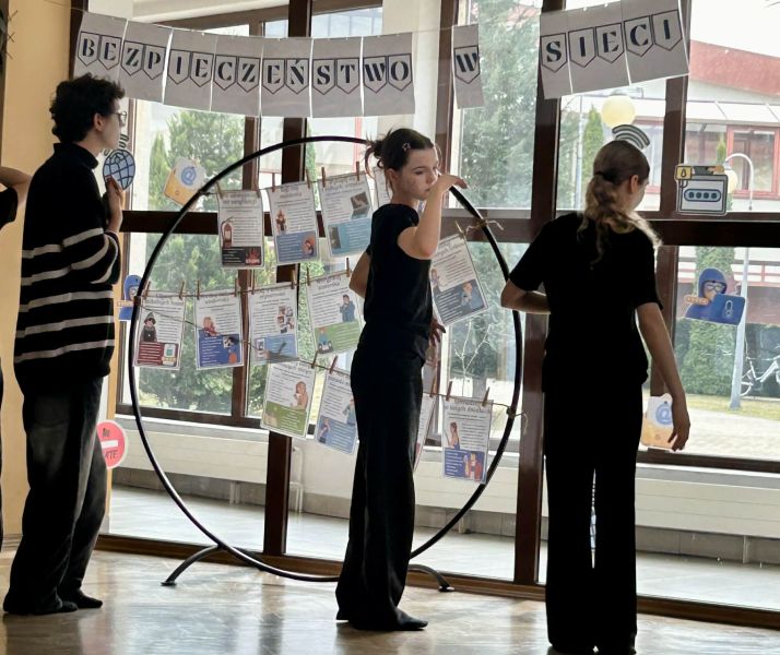 Centralnym punktem wydarzenia było niezwykłe przedstawienie pantomimiczne pt. „Marionetki”, przygotowane przez aktorów Szkolnego Koła Teatralnego „Kwadrat”. Spektakl w sugestywny i symboliczny sposób ukazywał mechanizmy manipulacji, które mogą pojawiać się w świecie online. Aktorzy, operując ruchem i gestem, stworzyli przejmującą opowieść o tym, jak łatwo można zostać „uwikłanym” w sieć zależności, pozorów i fałszywych relacji. Przedstawienie przypomniało widzom, że Internet – choć pełen możliwości – może stać się pułapką, jeśli nie korzystamy z niego świadomie i odpowiedzialnie. Szczególnie wybrzmiała myśl, że nigdy do końca nie wiemy, kto znajduje się po drugiej stronie ekranu i jakie są jego prawdziwe intencje oraz jaki swój cyfrowy ślad pozostawiamy w Internecie.