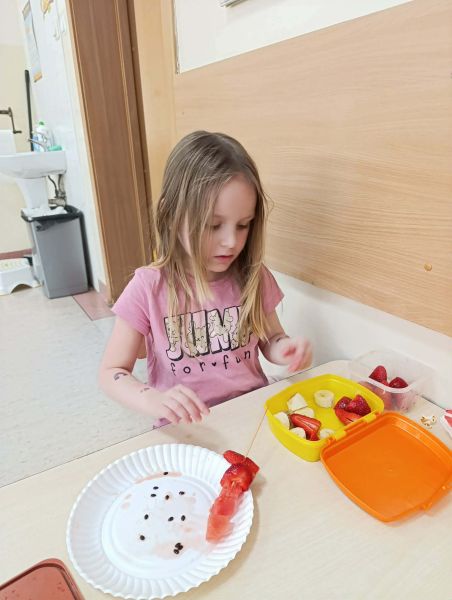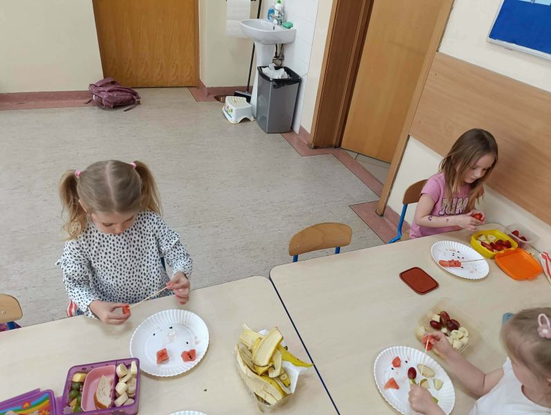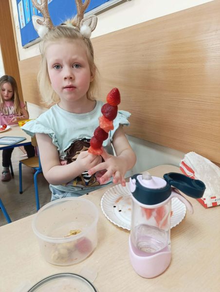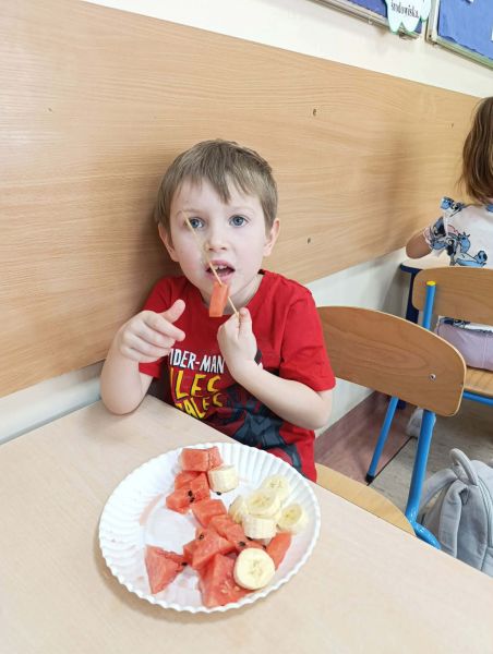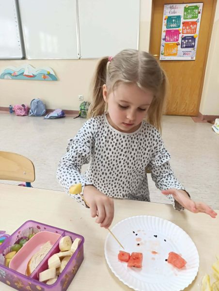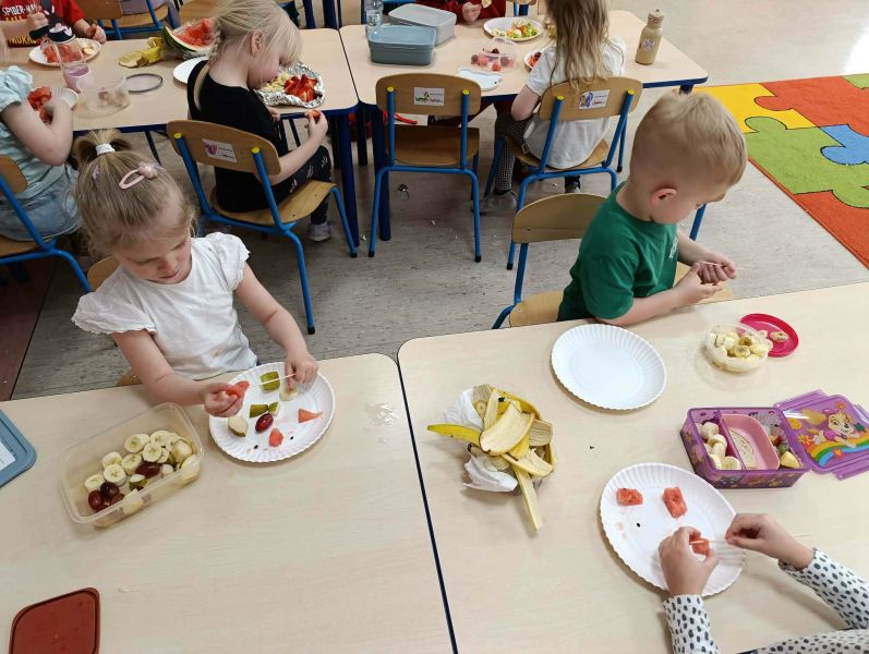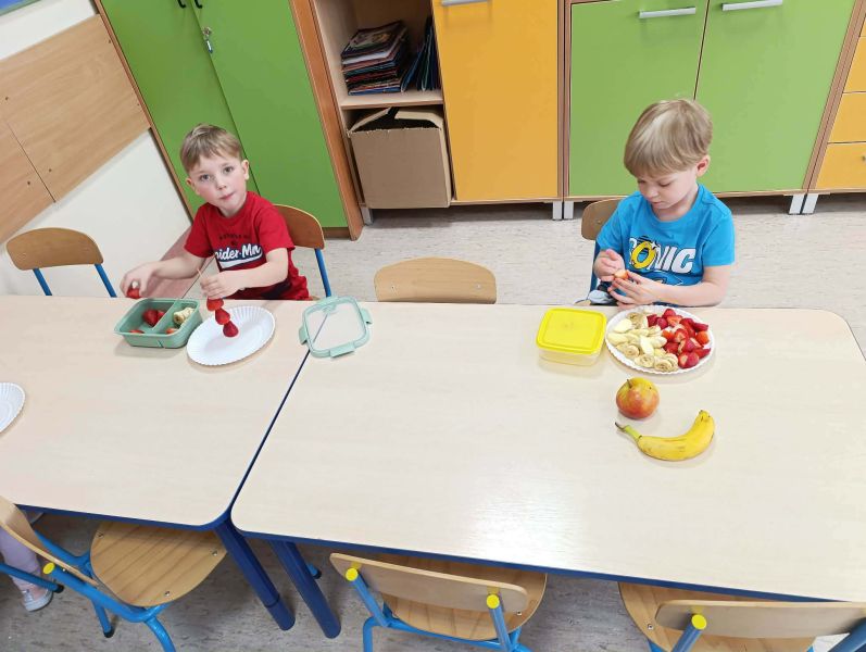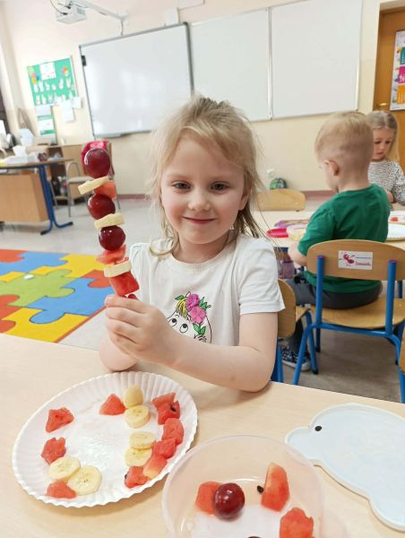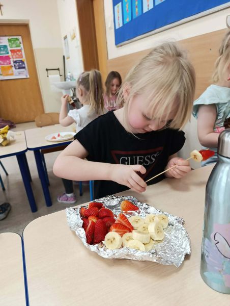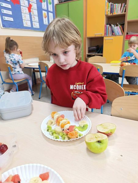 W Oddziale 0d rozmawialiśmy – zarówno o tych dobrze znanych, jak i mniej popularnych. Maluszki chętnie dzieliły się swoją wiedzą i doświadczeniami. W trakcie zajęć wykonaliśmy również pracę plastyczną inspirowaną owocami, a na zakończenie przygotowaliśmy i wspólnie skosztowaliśmy pysznych szaszłyków owocowych.