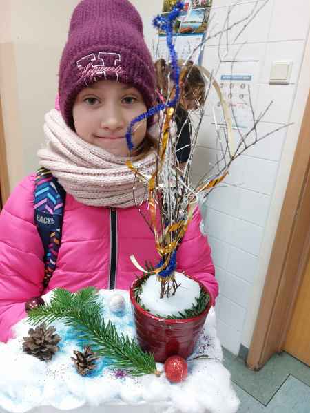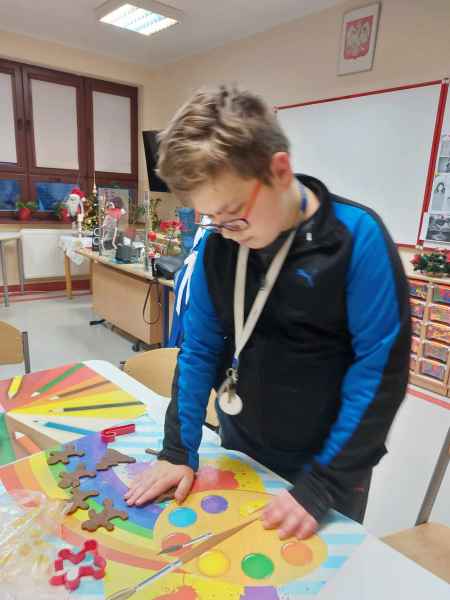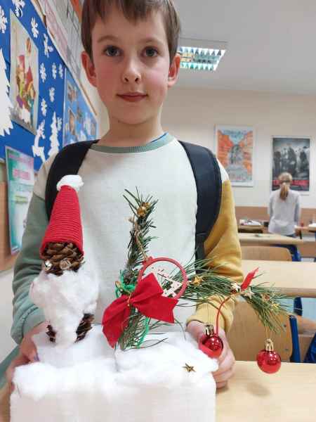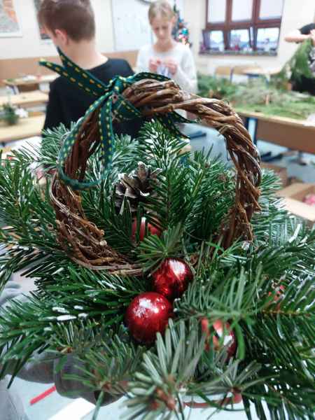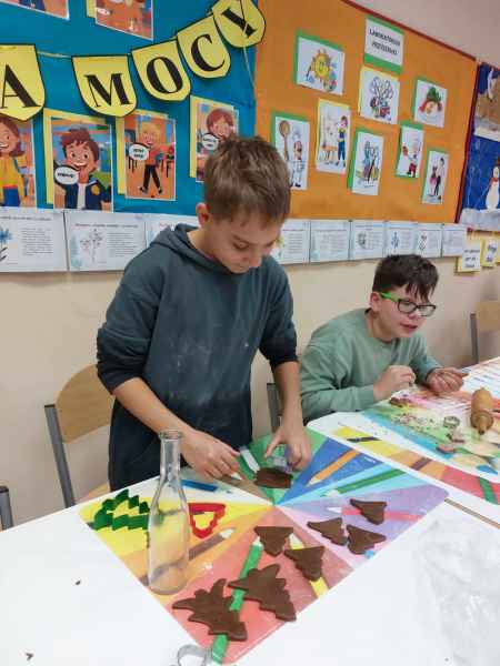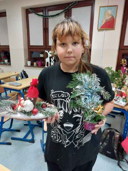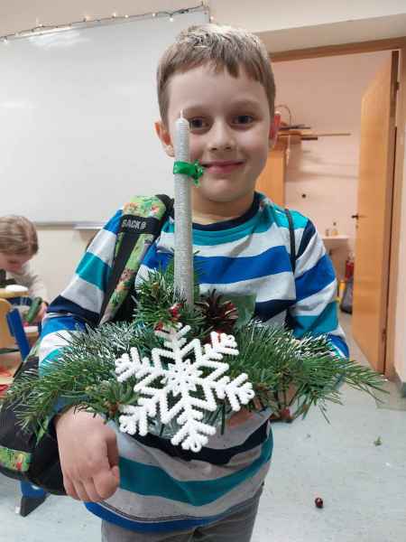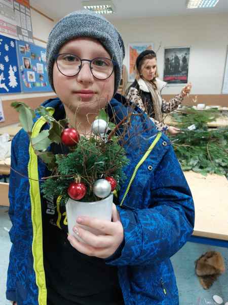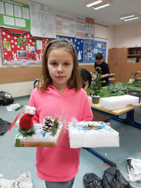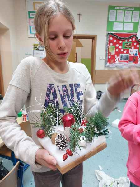 Kolejne zajęcia upłynęły na przygotowaniu postaci gwiazdora z szyszki oraz stroiku świątecznego z gałązek świerka, szyszek, wstążek, bombek, świeczek i innych elementów zdobniczych.