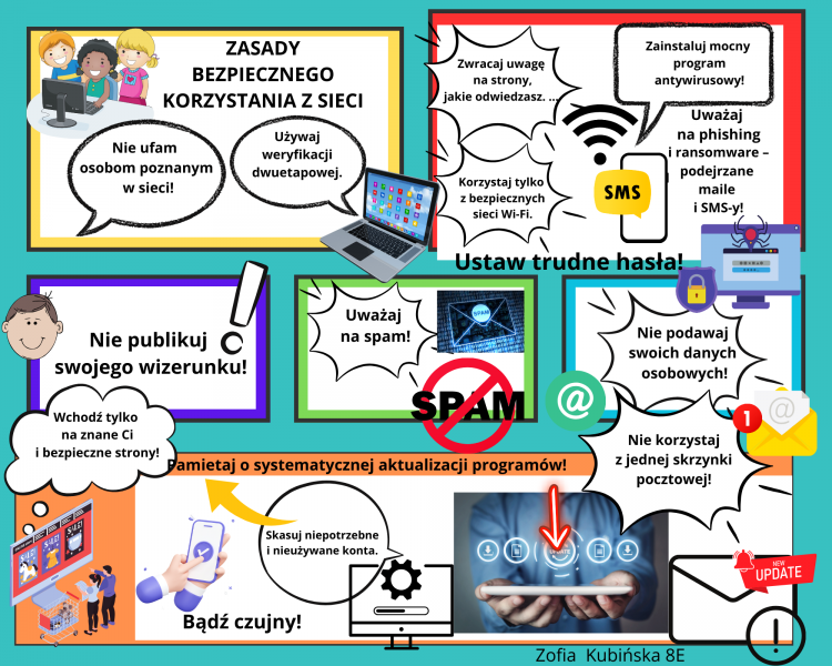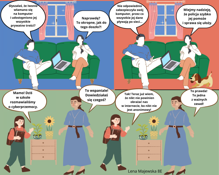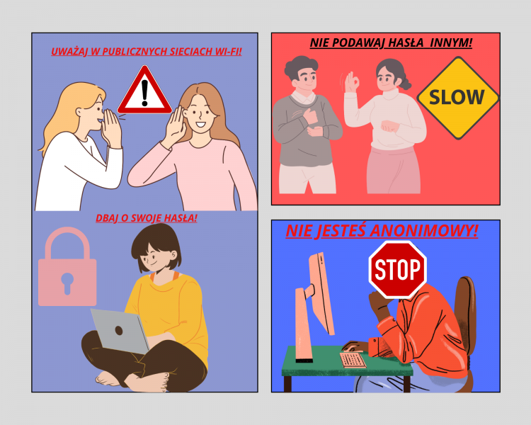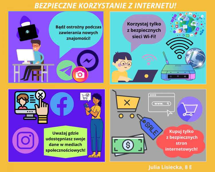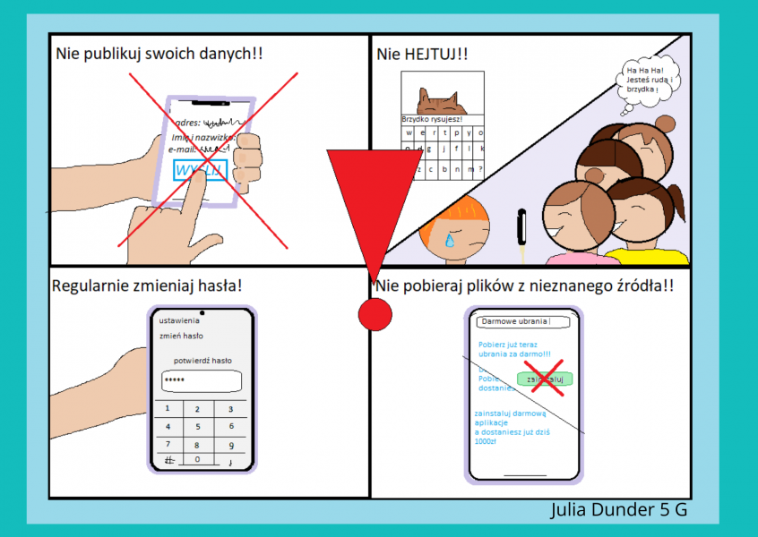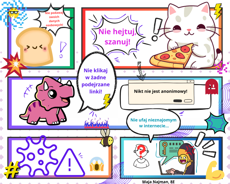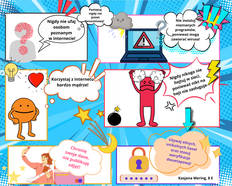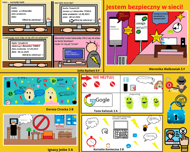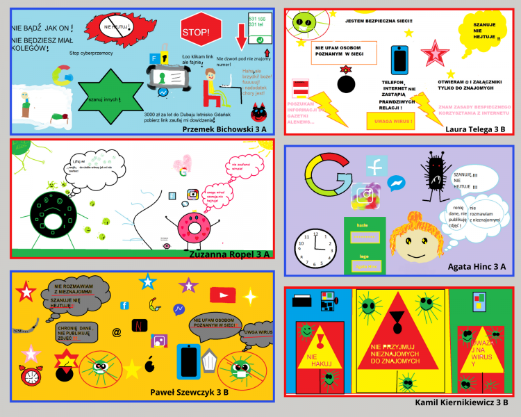 Uczestnicy projektu wykazali się kreatywnością, tworząc wyjątkowe prezentacje w PowerPoint, plakaty graficzne, plakaty w edytorze tekstowym oraz infografiki, memy i komiksy w programie Canva. Każda praca była nie tylko estetyczna, ale także zawierała istotne informacje dotyczące bezpiecznego korzystania z Internetu. W ten sposób uczniowie nie tylko doskonalili swoje umiejętności informatyczne, ale również zdobyli praktyczną wiedzę na temat ochrony przed cyberprzemocą. Uczniowie podczas lekcji informatyki mieli okazję uczestniczyć w interesujących rozmowach z nauczycielami, oglądać edukacyjne filmyoraz rozwijać swoje umiejętności w dziedzinie grafiki komputerowej. Zdobytą wiedzę i umiejętności teraz można z łatwością przenieść do domu, co stwarza doskonałą okazjędo rozmów z rodzicami i dziadkami na temat bezpieczeństwa online. Dzieci i młodzież mogą podzielić się swoimi doświadczeniami, omówić ważne zagadnienia związane z cyberbezpieczeństwem i jednocześnie integrować rodzinę podczas tej edukacyjnej podróży.