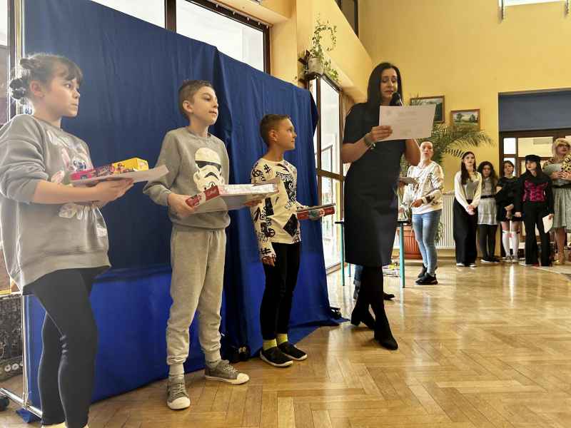Dzisiejszego dnia nie tylko przedstawienie dostarczyło emocji, wręczono również nagrody dla laureatów konkursów informatycznych: w kategorii plakat, komiks i prezentacja. Nagrody ufundowane zostały przez Panią Dyrektor, Bożenę Brzuzy, oraz nauczycieli informatyki, za co serdecznie dziękujemy. Prace konkursowe wyróżniały się wysokim poziomem graficznym oraz głęboką znajomością zasad bezpiecznego korzystania z Internetu, co świadczyło o zaangażowaniu uczniów w projekt. Estetyka prac konkursowych zaskoczyła zarówno uczniów jak i nauczycieli. Zakładając, że kolejna edycja projektu odbędzie się za rok, możemy oczekiwać jeszcze większego zaangażowania i kreatywności uczniów, którzy dzięki takim inicjatywom będą coraz bardziej świadomi zagrożeń wynikających z korzystania z Internetu.
