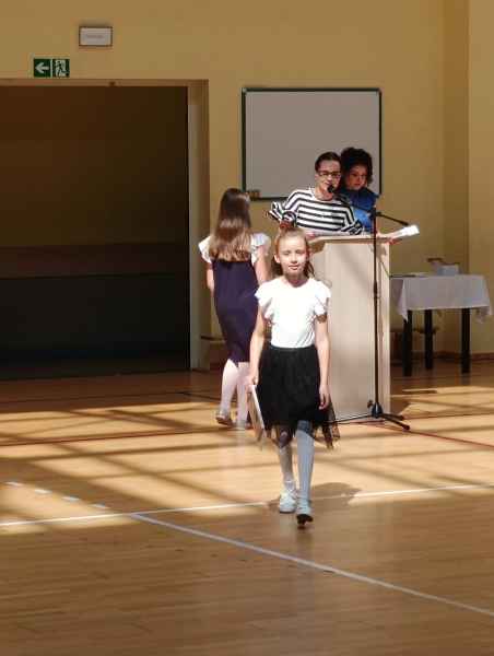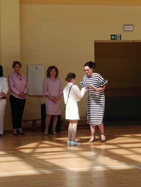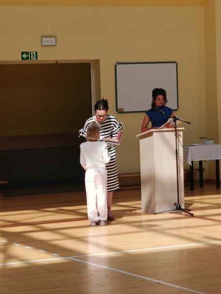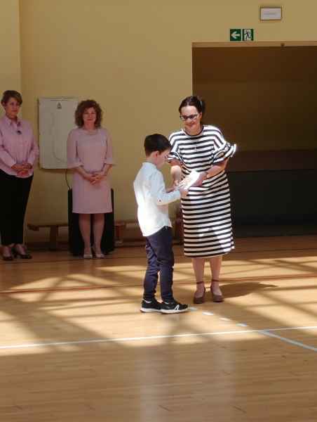 Podczas Uroczystości oddziały przedszkolne oraz wczesnoszkolne dumnie i głośno odśpiewali Hymn Narodowy. Jak się okazało zbędny był podkład muzyczny, gdyż najmłodsi uczniowie naszej szkoły pięknie wyśpiewali swój patriotyzm. Po nim były uroczyste słowa Pani Dyrektor Bożeny Brzuzy oraz piękne słowa Pani Martiny Kankowskiej. Następnie Pani Małgorzata Jednoralska-Józefczyk wręczyła dyplomy i książkinajbardziej aktywnym czytelnikom Biblioteki Motyli. Gratulujemy wszystkim wyróżnionym dzieciom! Po uroczystości na hali sportowej klasy wraz z wychowawczyniami udali się do sal, by odebrać świadectwo szkolne.