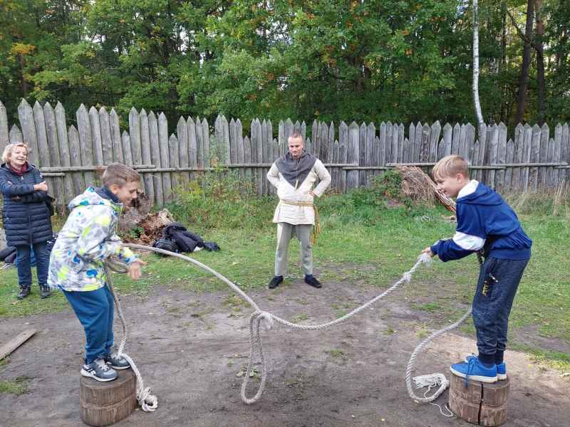 Kolejnym punktem wycieczki, po żywej lekcji historii, był udział w średniowiecznych zabawach, które integrowały, uczyły współpracy w grupie i zdrowej, sportowej rywalizacji. Uczestnicy wyjazdu podzieleni na 2 grupy sprawdzali cechy niezmiernie ważne u ludzi żyjących w średniowieczu takie jak: spryt, zaradność, rozwagę i siłę podczas konkurencji o nazwach: suche buty, sztuka abordażu, próby celności czy trzyosobowe narty. Oba zespoły wspaniale bawiły się i dzielnie walczyły, a końcowy wynik był remisem.