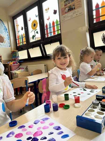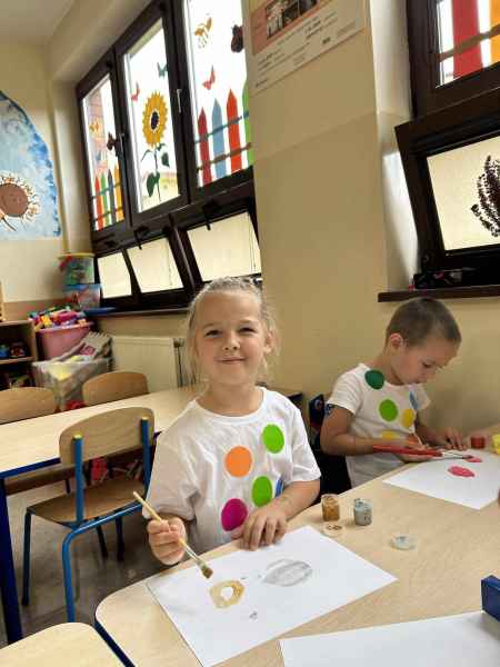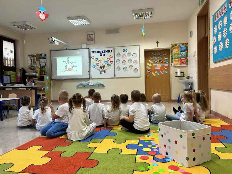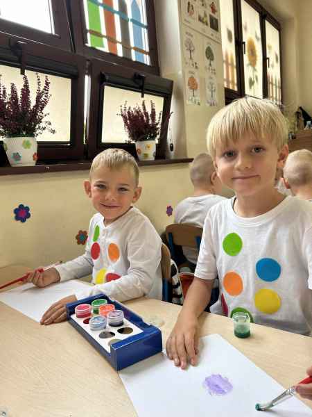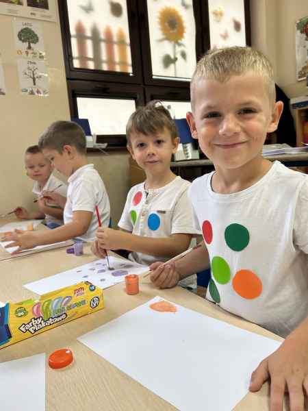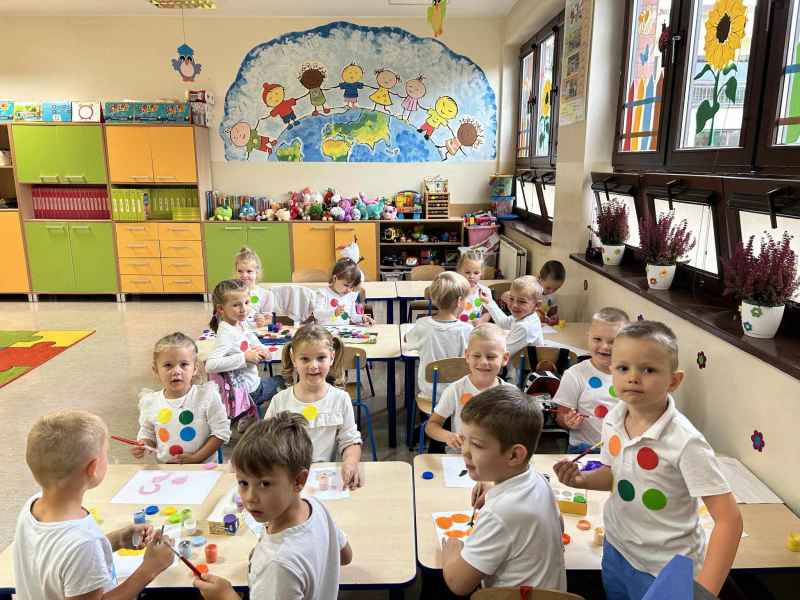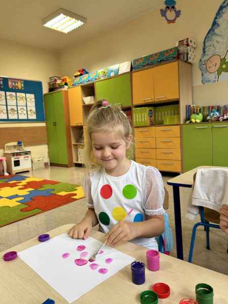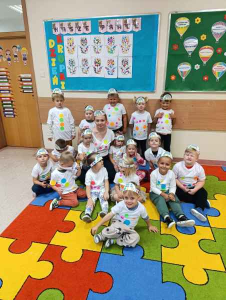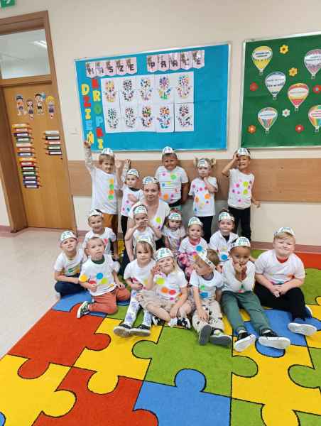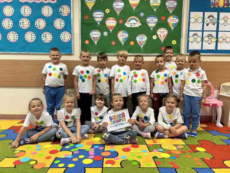 13 września oddziały 0c i 0d obchodziły Międzynarodowy Dzień kropki... Dzień Kropki jest to dzień odwagi i zabawy. Tego dnia nasze zabawy wypełnione były kolorowymi kropkami. Na zajęciach poznaliśmy genezę tego święta. Dzieci uważnie wysłuchały opowiadania, jak to zwyczajna kropka zmieniła świat małej dziewczynki o imieniu Vashti. Historia ta uświadomiła przedszkolakom, że każdy z nas ma jakieś ukryte zdolności, talent.