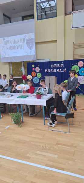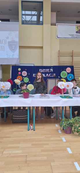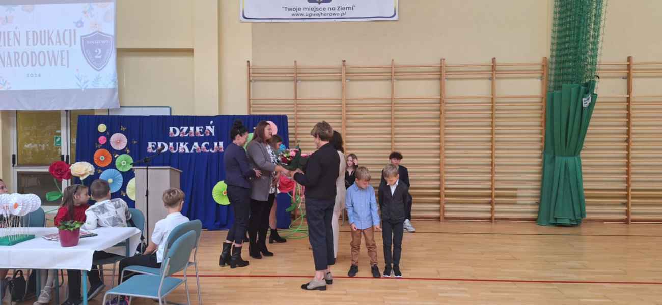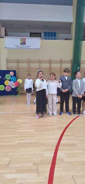 Były także przemowy i podziękowania. Piękne życzenia skierowała do wszystkich Pani Dyrektor Bożena Brzuzy, Przedstawiciele Rady Rodziców oraz Przewodniczący Samorządu Uczniowskiego. Współpraca klas młodszych z starszymi pozwoliła przygotować tak wspaniałą uroczystość! Każdy z obecnych nauczycieli otrzymał laurkę oraz kwiatka.