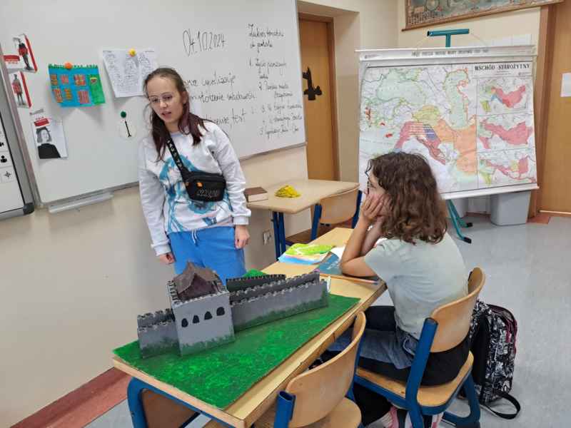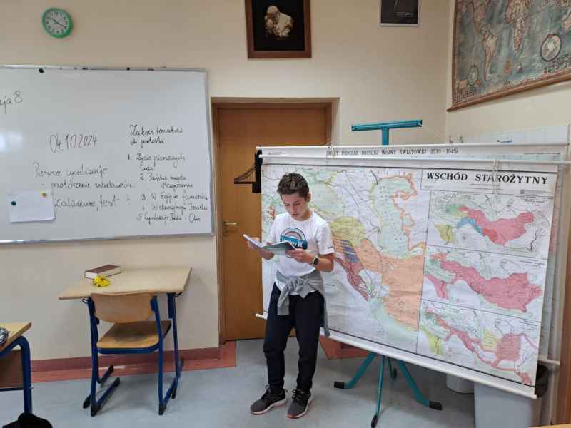 Klasa 5c utrwalała wiadomości o pierwszych cywilizacjach. Oliwia i Julian odegrali role faraona i kapłana w starożytnym Egipcie. Mumifikacja była niebywale trudna i czasochłonna. Piątoklasiści zaprezentowali także osiągnięcia cywilizacyjne mieszkańców Dalekiego Wschodu - Indii i Chin. W B1 202 pojawił się fragment Wielkiego Muru Chińskiego, wojownicy Armii Terakotowej , kompas, papier czerpany, porcelanowe filiżanki czy wazy. Uczniowie wiedzą, że algebra, geometria i liczba " zero" mają swój początek w Indiach