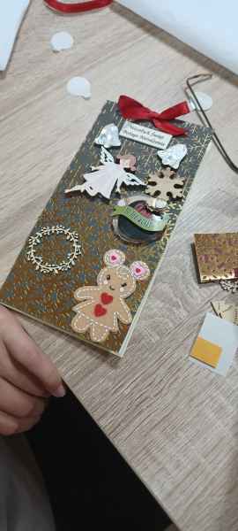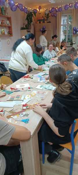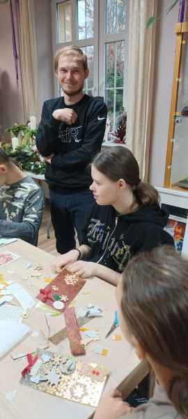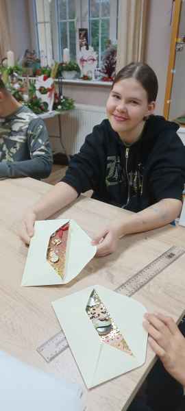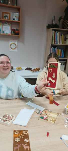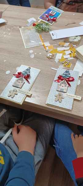 Na początku spotkania nasi uczniowie mieli okazję zobaczyć pracownię obróbki artystycznej drewna, plastyczną, ceramiczną i gospodarstwa domowego. W czasie wizyty dzieci pod opieką terapeutów i z pomocą uczestników wykonali kartki bożonarodzeniowe. Spotkanie zakończyło się słodkim poczęstunkiem.