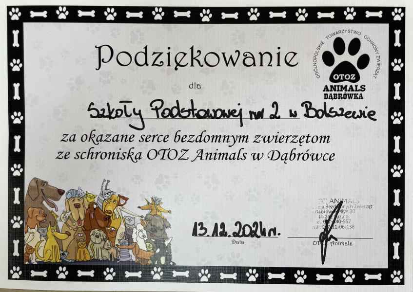 Szkolne koło wolontariatu „UCZYnna dwójka” zakończyło kolejną edycję zbiórki darów dla Podopiecznych Schroniska dla Bezdomnych Zwierząt OTOZ Animals w Dąbrówce. I tym razem nasi uczniowie nie pozostali obojętni na potrzeby bezdomnych zwierząt. Dziękujemy wszystkim zaangażowanym w tą akcję. Szczególne podziękowania kierujemy pod adresem Magdy i Dajany z klasy 6f oraz Państwa Doroty i Łukasza Drewa, którzy zadbali o to, aby zebrane przez nas dary trafiły do naszych czworonożnych przyjaciół.