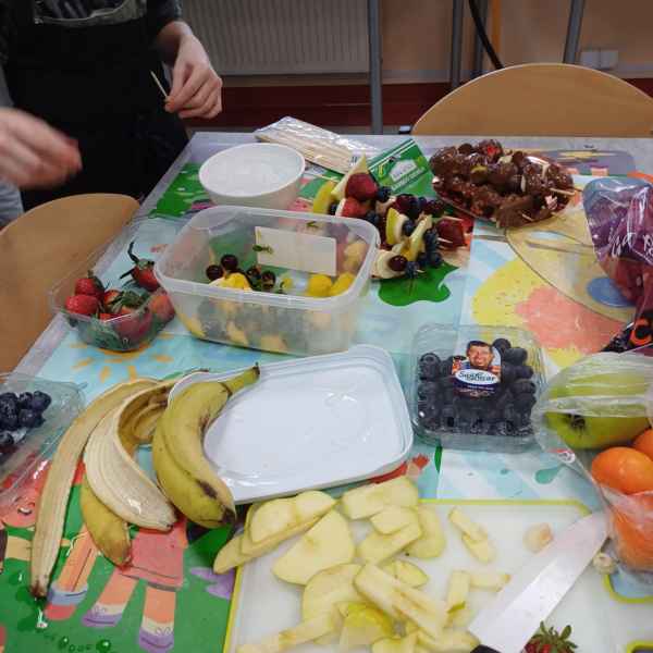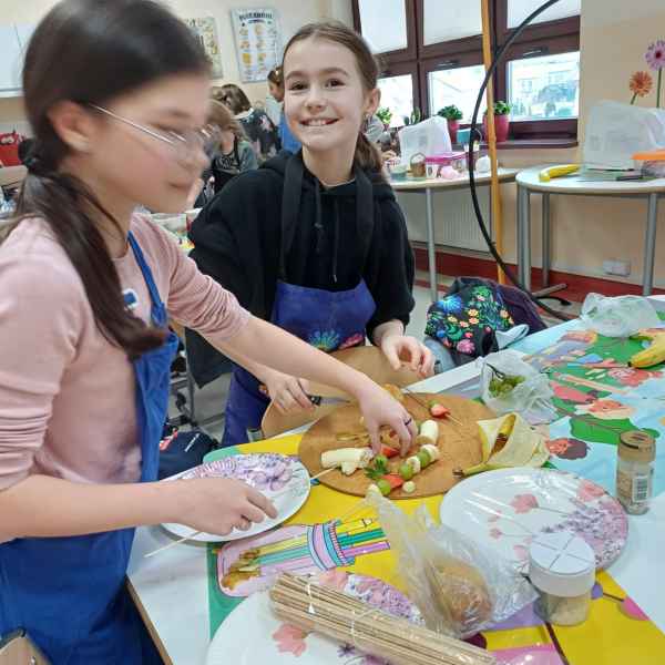 Jednym z zadań było przygotowanie owocowych szaszłyków w polewie czekoladowej. Uczniowie wykazali się dużą kreatywnością przy dobieraniu owoców, łącząc różnorodne smaki i kolory. Na patyczki nakładały się kawałki soczystych truskawek, bananów, winogron oraz jabłek, a na końcu każdy szaszłyk zanurzany był w rozpuszczonej czekoladzie. Owocowe połączenie z czekoladową polewą to idealna opcja na zdrową, a zarazem pyszną przekąskę.