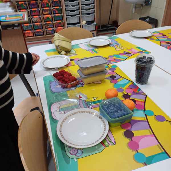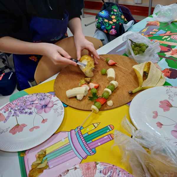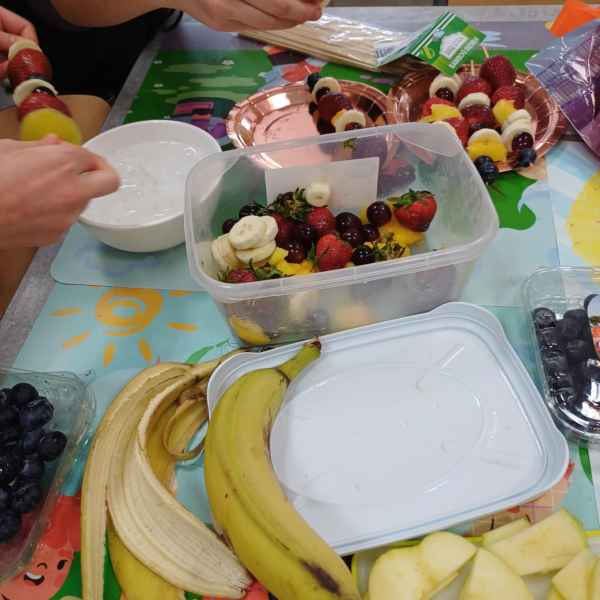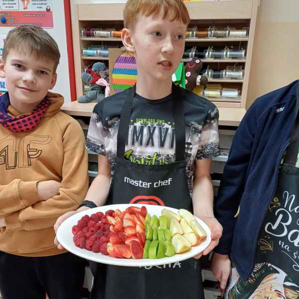 Kolejnym wyzwaniem dla uczniów była sałatka owocowa, która stała się prawdziwym dziełem sztuki. W grupach uczniowie obierali i kroili owoce, dbając o precyzyjne cięcie i odpowiednią kompozycję smakową. W skład sałatki wchodziły najróżniejsze owoce – od jabłek po kiwi, maliny czy borówki. Całość dopełniały jogurt naturalny lub miód, które były używane jako dressing do sałatki. Uczniowie chwalili się swoimi dziełami, a efekt końcowy okazał się równie smaczny, co estetyczny.