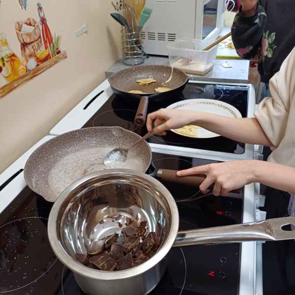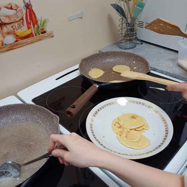 Grupa dziewcząt  przygotowała  pankejki z owocami. Grupa miały za zadanie nie tylko zrobić ciasto na puszyste naleśniki, ale również odpowiednio je udekorować. Pankejki były podawane z różnymi owocami – od truskawek i jagód po banany i maliny – oraz posypane odrobiną cukru pudru. Zajęcia pozwoliły uczniom nauczyć się, jak przygotować ten klasyczny przysmak w zdrowej wersji.
