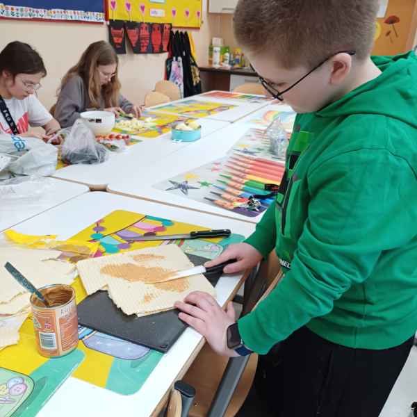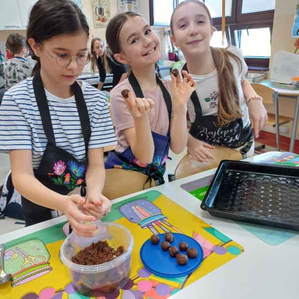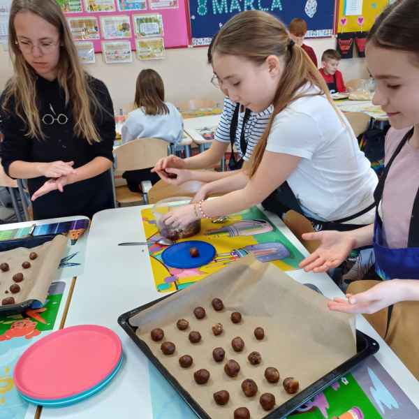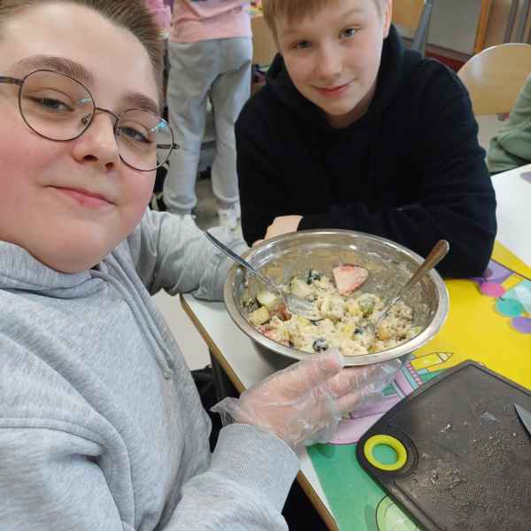 Każdy uczestnik mógł przekonać się, jak ważne jest przestrzeganie zasad, aby gotowanie było zarówno przyjemne, jak i bezpieczne. W programie zajęć znalazły się różnorodne aktywności: od nauki prawidłowego krojenia i przygotowywania składników, przez pieczenie, aż po dekorowanie potraw. Uczniowie pracowali w grupach, co pozwoliło im rozwijać umiejętności współpracy i kreatywności. Nie zabrakło również elementu zabawy! Dzieci wzięły udział w kulinarnych wyzwaniach, które dostarczyły im wielu emocji. Na zakończenie zajęć odbyła się degustacja przygotowanych potraw, gdzie każdy mógł spróbować efektów pracy swoich kolegów i koleżanek. Zajęcia kulinarne w Laboratorium Przyszłości okazały się doskonałą okazją do nauki, rozwoju pasji kulinarnych oraz wspólnego spędzania czasu w radosnej atmosferze. Uczniowie już planują kolejne kulinarne wyzwania i nie mogą się doczekać, co przyniosą następne spotkania! Dziękujemy pani Bożenie Reszke za inspirujące zajęcia i czekamy na kolejne pyszne przygody w Laboratorium Przyszłości!