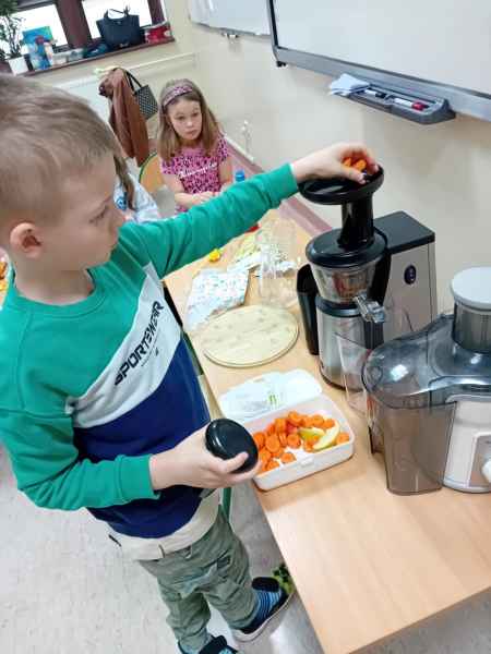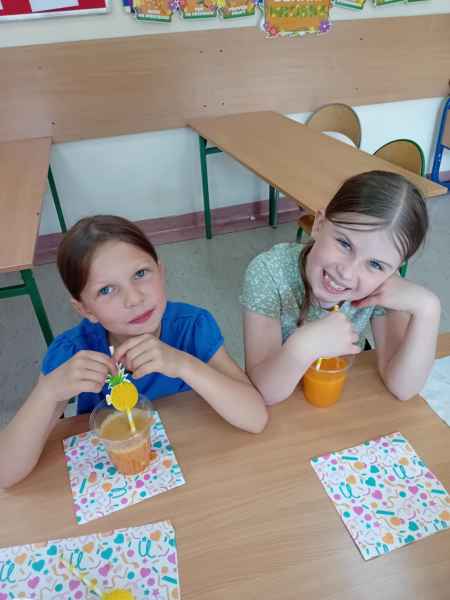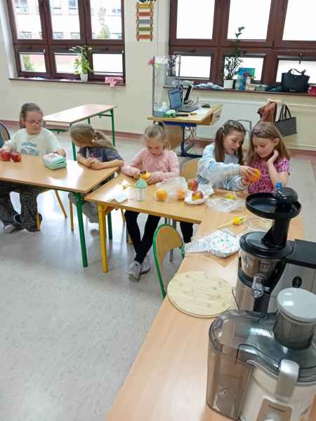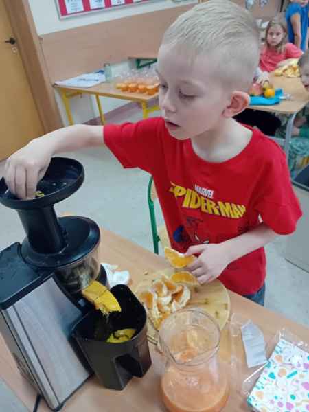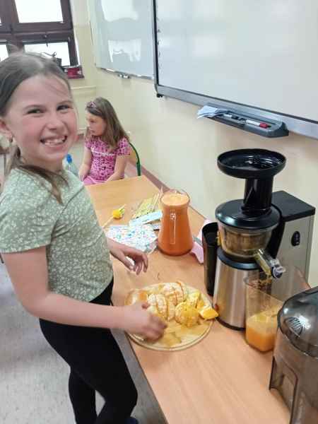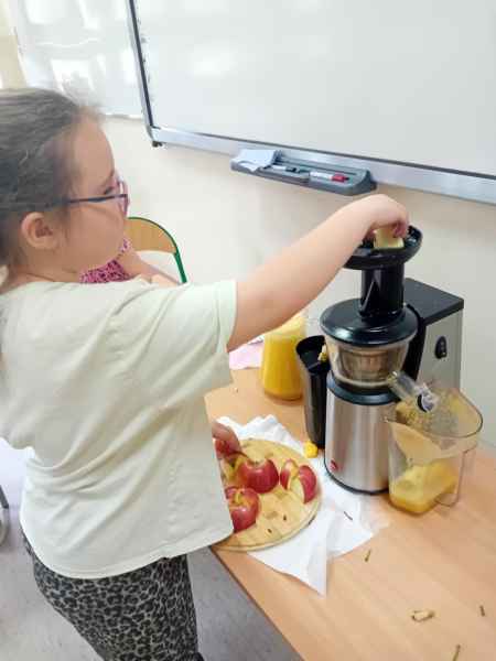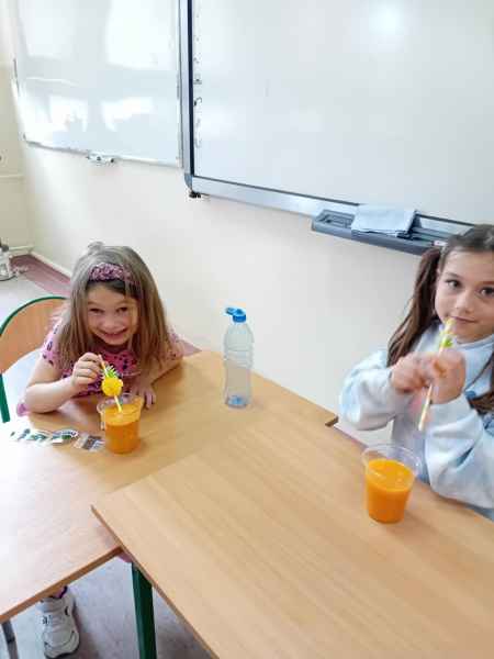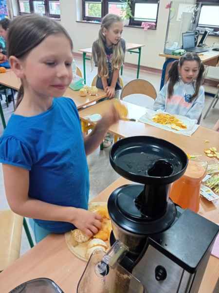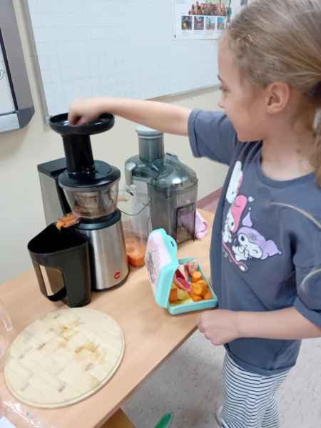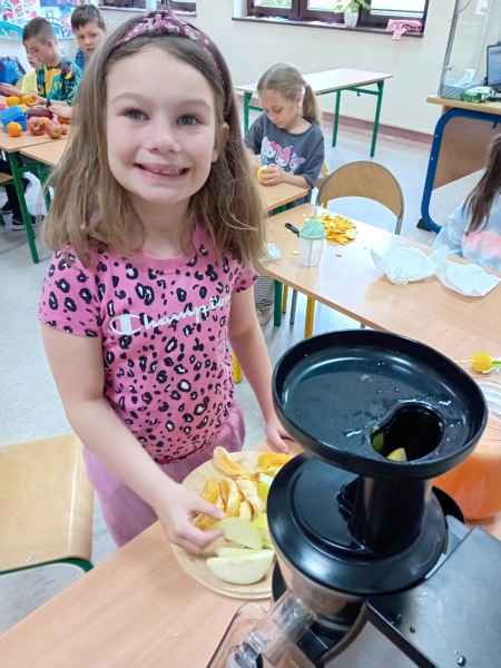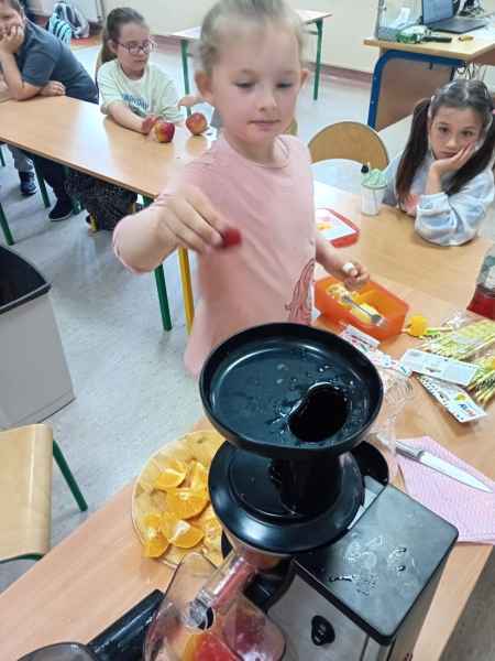 Ib wpadła na pomysł aby wspólnie zrobić pyszne, zdrowe soki. Dzieci podołały, sokowirówki również! Przyniosły tyle owoców że soku wystarczyło by dla całej szkoły! Pomarańczowe, jabłkowe, marchewkowe, mango...wszyscy degustowali soki. Było bardzo słodko ale co najważniejsze zdrowo!