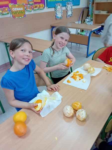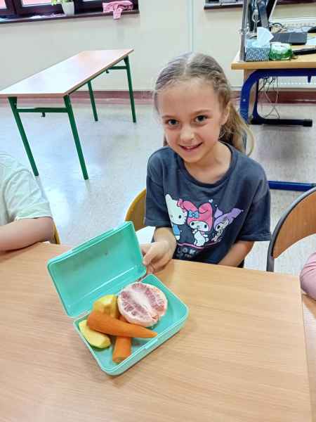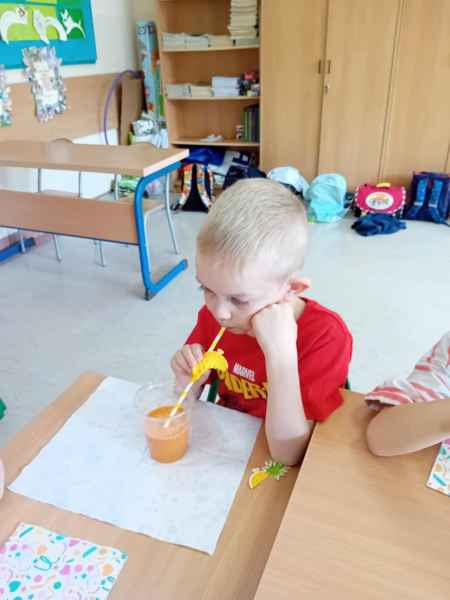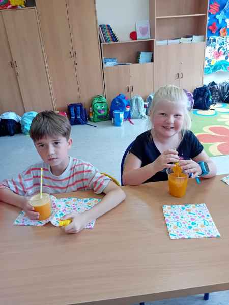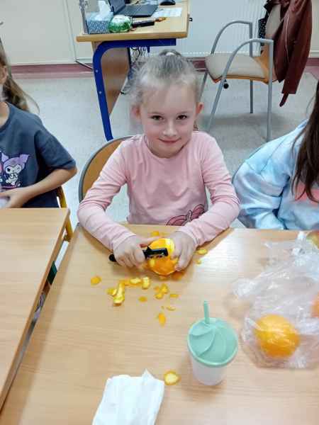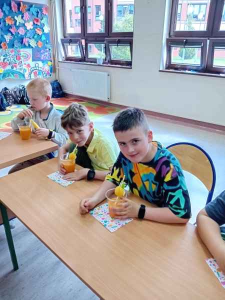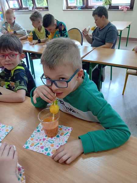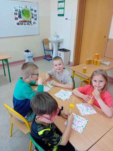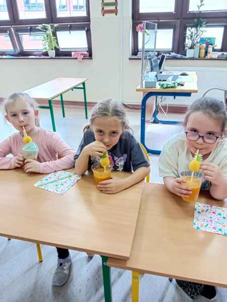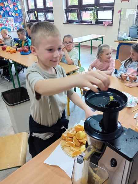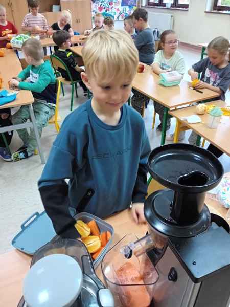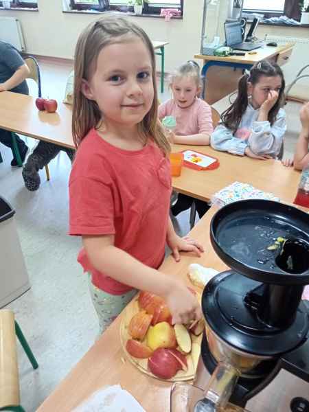 Ib wpadła na pomysł aby wspólnie zrobić pyszne, zdrowe soki. Dzieci podołały, sokowirówki również! Przyniosły tyle owoców że soku wystarczyło by dla całej szkoły! Pomarańczowe, jabłkowe, marchewkowe, mango...wszyscy degustowali soki. Było bardzo słodko ale co najważniejsze zdrowo!