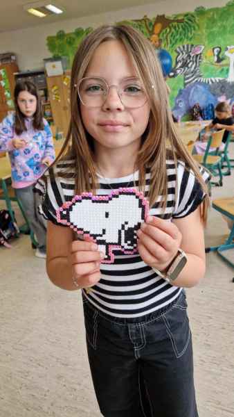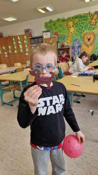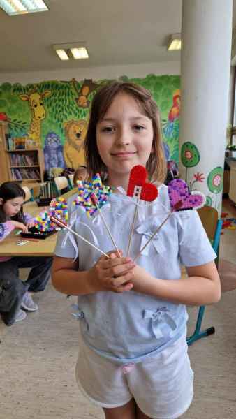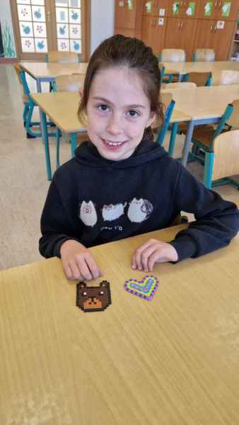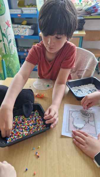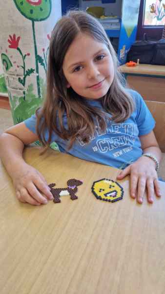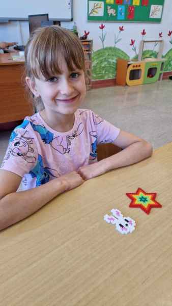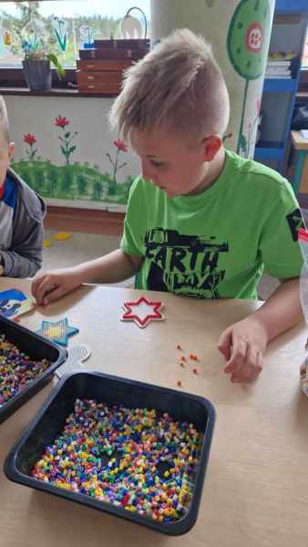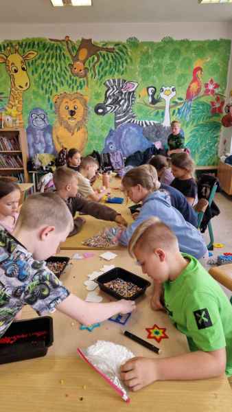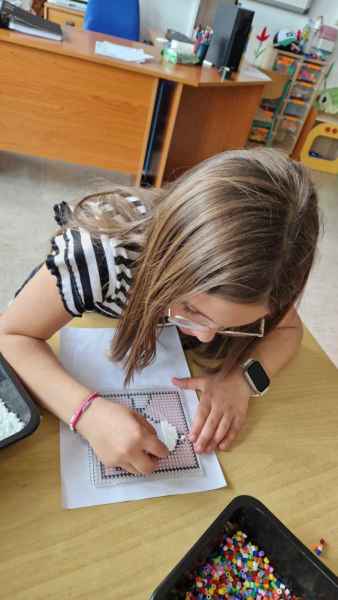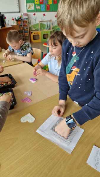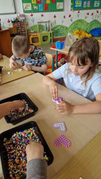 " Koralik jeden, potem dwa. Już praca wre, zabawa trwa". Dokładnie tak, jak w przytoczonym fragmencie wiersza, świetliczki układały kolorowe paciorki, żeby stworzyć obrazy, ramki i zabawki. Feria barw pobudzała wyobraźnię dzieci. Zabawa z koralikami wymagała także skupienia cierpliwości i spostrzegawczości. Podczas tworzenia kompozycji dzieci ćwiczyły: motorykę małą, kordynację wzrokowo- ruchową, rozpoznawanie kształtów i kolorów oraz planowanie i myślenie przyczynowo- skutkowe. Efekty pracy naszych podopiecznych prezentujemy poniżej.