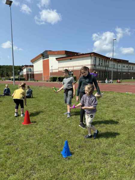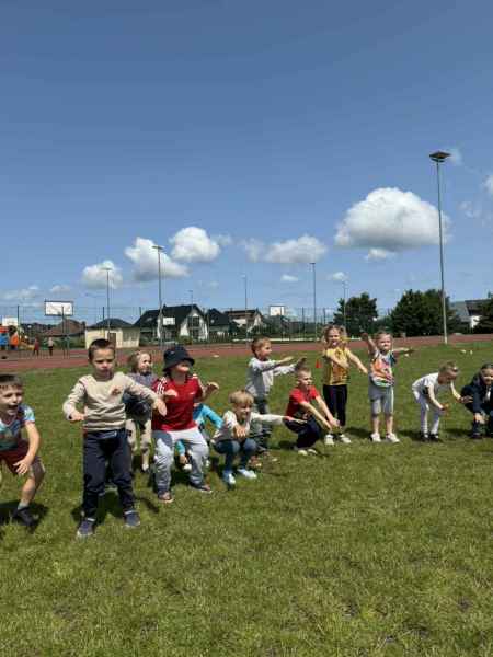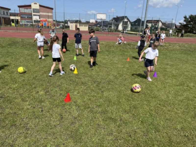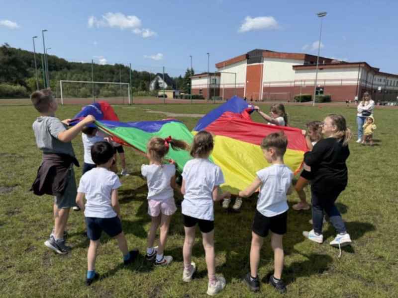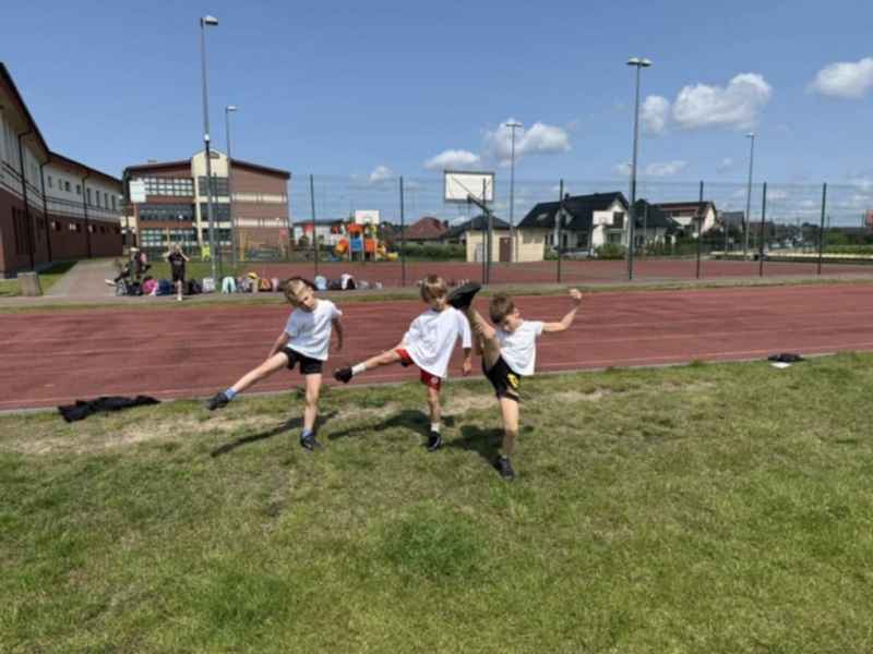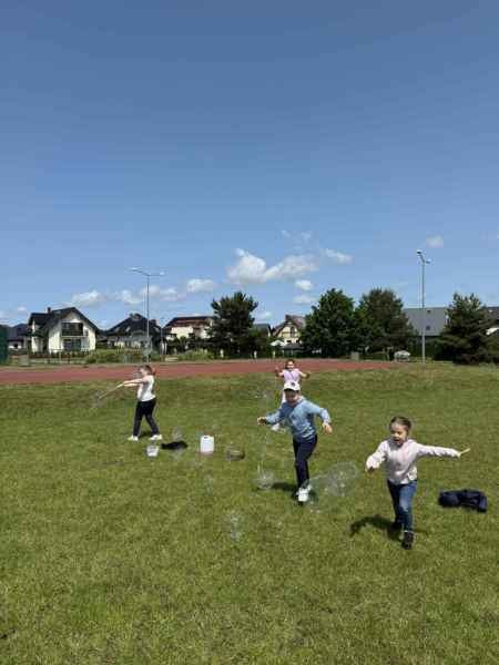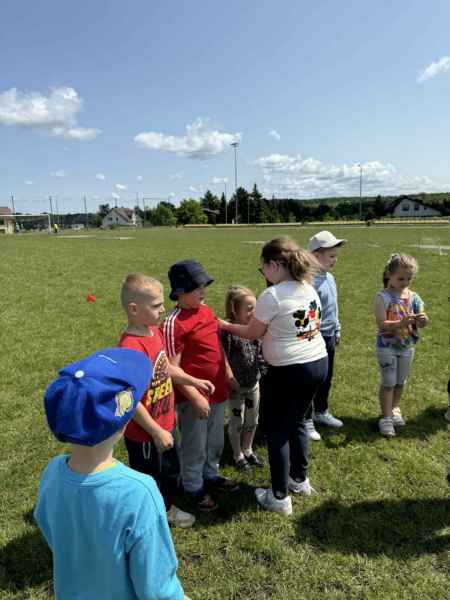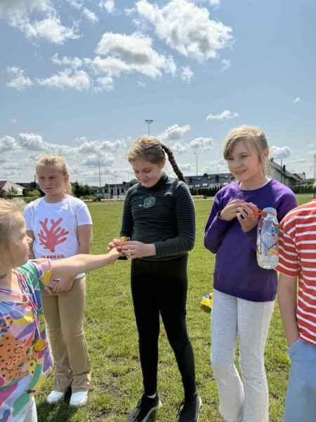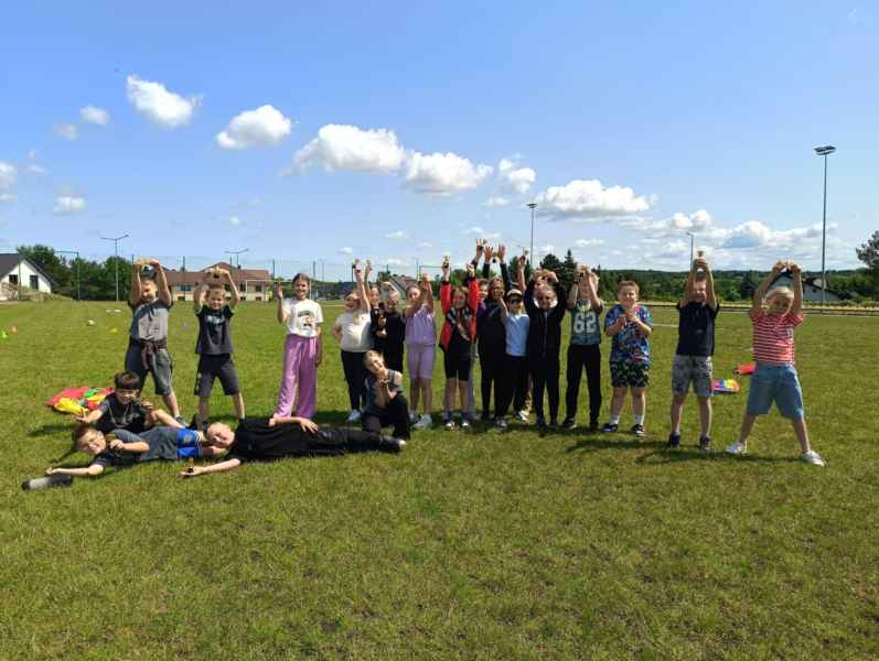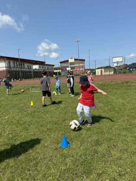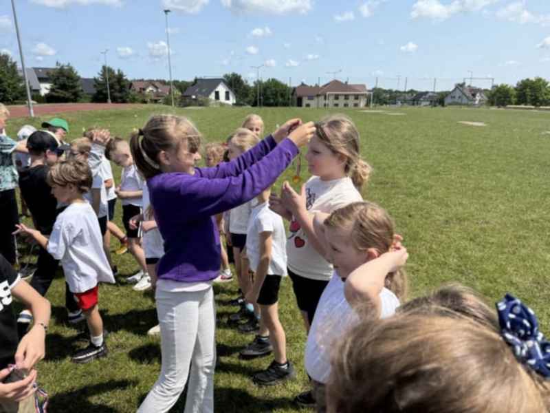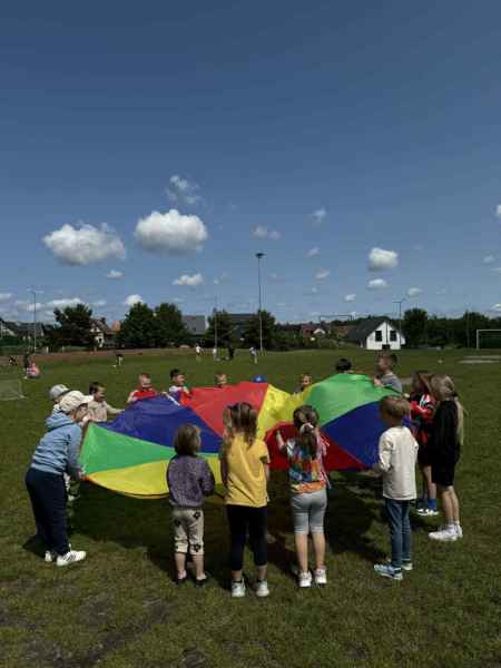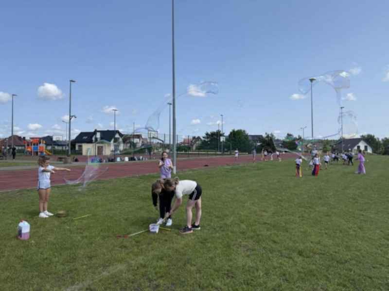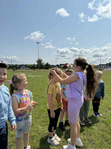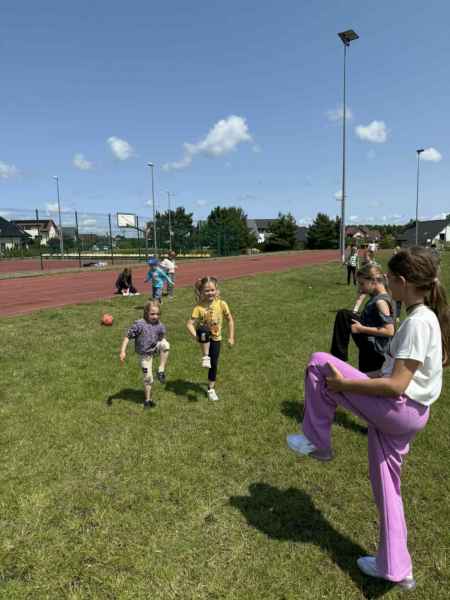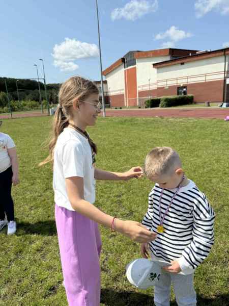 Uczniowie z klasy 3d przygotowali sportowe stacje zadaniowe dla swoich młodszych kolegów i koleżanek z oddziałów 0b i 0c. Na przedszkolaki czekały mega bańki mydlane, slalom z piłką, zabawa w liski, strzelanie goli, skoki w workach, konkurencja z łyżkami, zabawy z chustą a nawet stacja z nauką tańca. Na zakończenie spotkania, zwycięzcy zostali uhonorowani złotymi medalami. Dziękujemy za świetną zabawę!