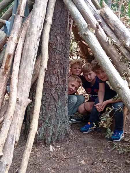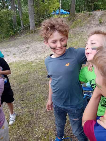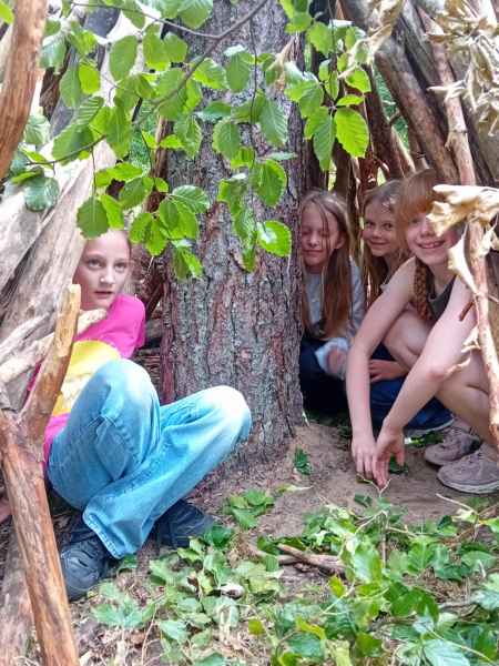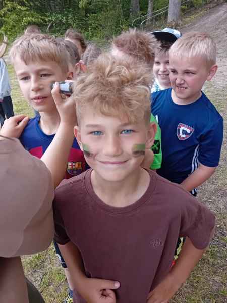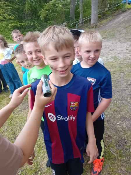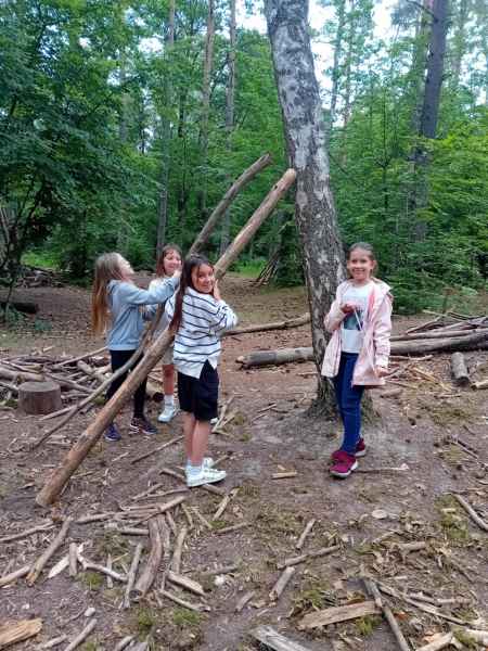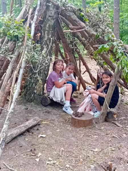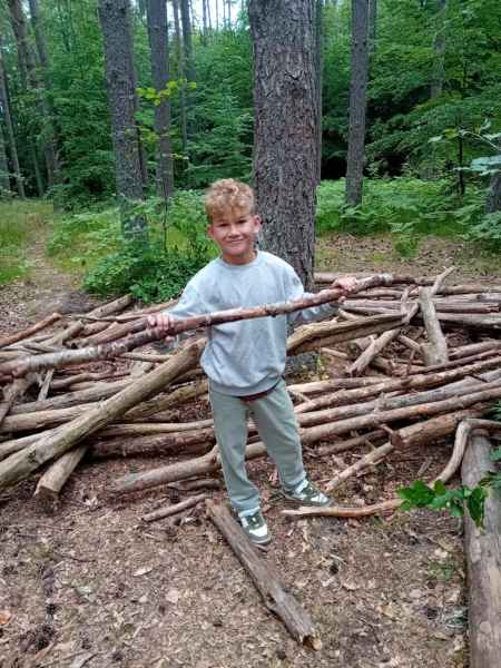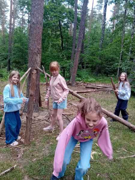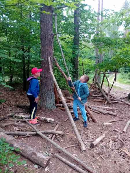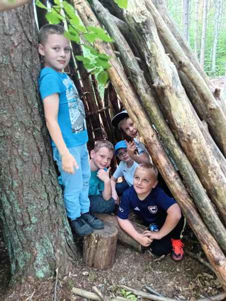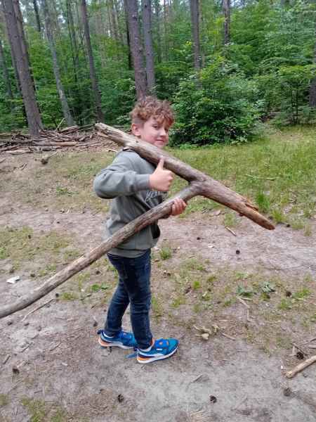 W ubiegłym tygodniu uczniowie klasy 2 a wzięli udział w wyjątkowej wycieczce na łono natury. Głównymi atrakcjami były budowanie szałasów oraz wspólne rozpalanie ogniska. Dzieci z ogromnym zaangażowaniem uczestniczyły w zajęciach, wykazując się kreatywnością, sprytem i współpracą. Nie zabrakło także elementów zdrowej rywalizacji – uczniowie podzieleni na grupy konkurowali w różnych zadaniach terenowych, co wywołało wiele emocji i radości. Cały dzień obfitował w uśmiechy, ruch i dobrą zabawę, a aktywności na świeżym powietrzu pomogły rozładować nagromadzoną energię. To była niezapomniana przygoda, która z pewnością pozostanie w pamięci dzieci na długo!