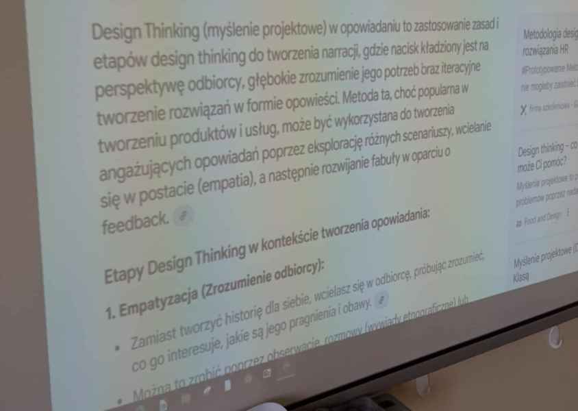 Podczas dzisiejszych zajęć, klasa 5 b miała okazję pracować metodą myślenia projektowego. To iteracyjne, kreatywne rozwiązanie problemów. Celem lekcji było stworzenie opowiadania. Poprzez wielokrotne powtarzanie jednej czynności, uczniom udało się stworzyć krótką opowieść pod tytułem " Śmieszny piątek". Praca przebiegła w miłej atmosferze, każdy uczestnik lekcji mógł decydować o treści opowiadania. Zaproponowana przez nauczyciela metoda pracy spodobała się uczniom. Dzieci miały szansę rozwijać kompetencje kluczowe, kreatywność oraz współpracować w grupie.