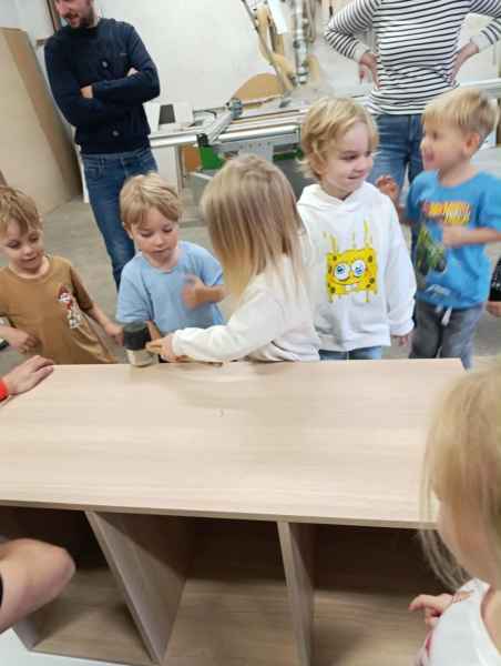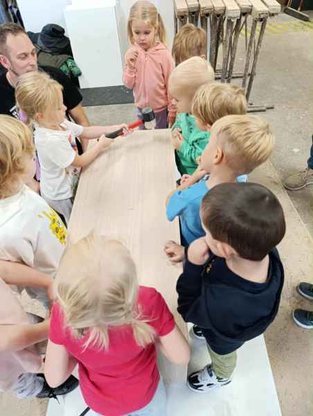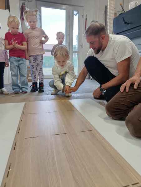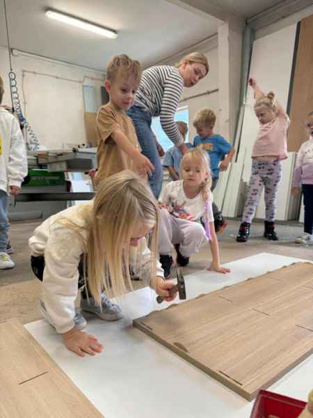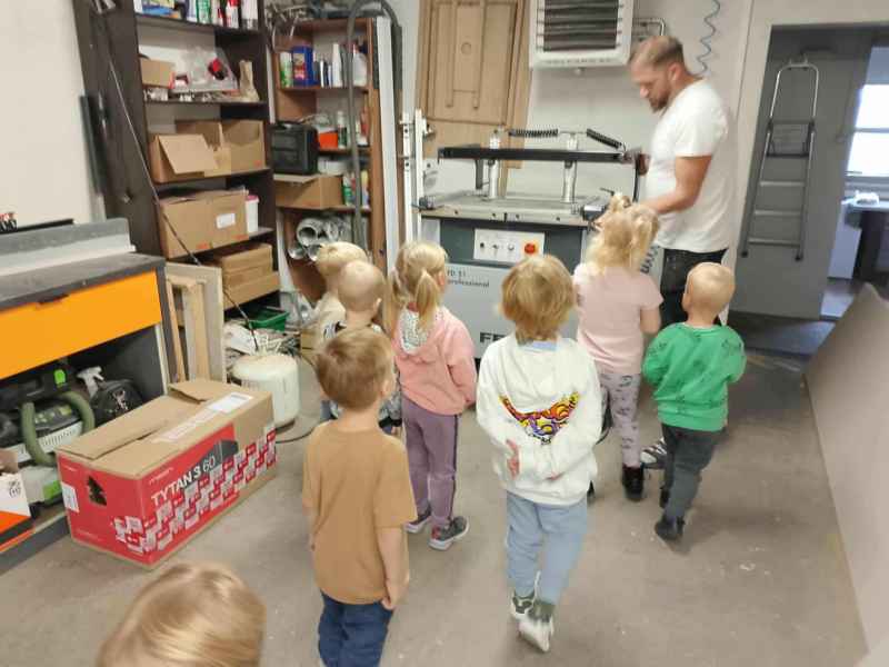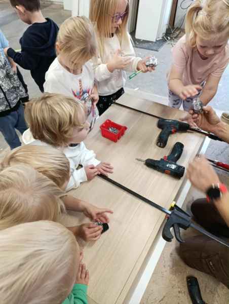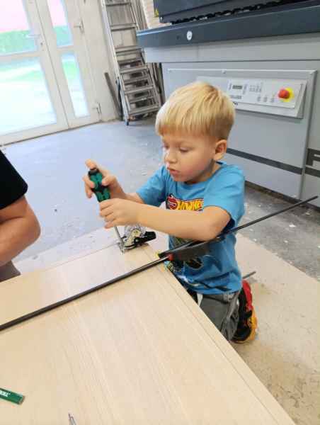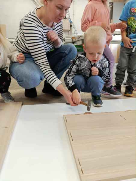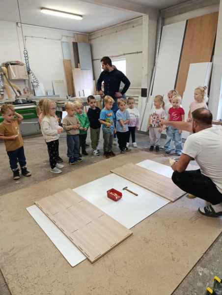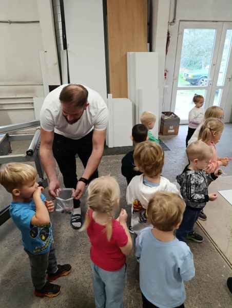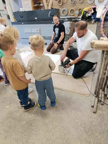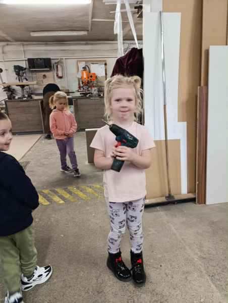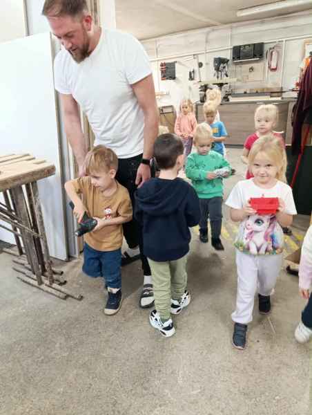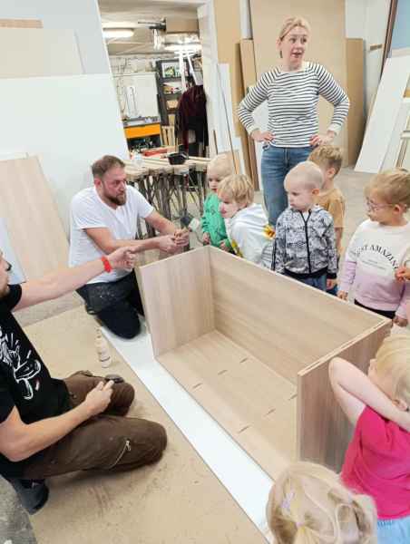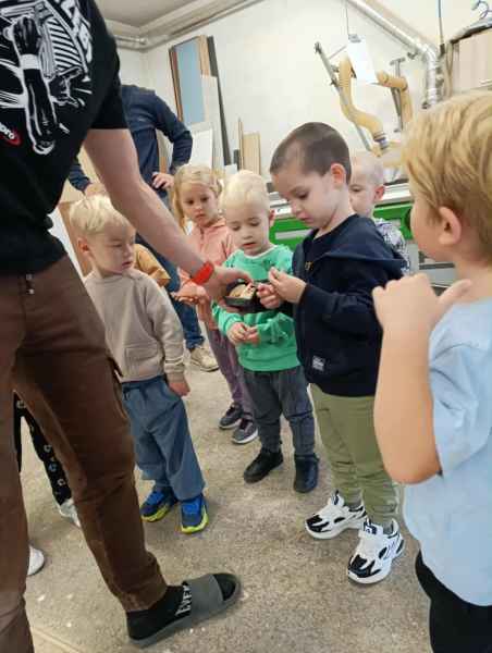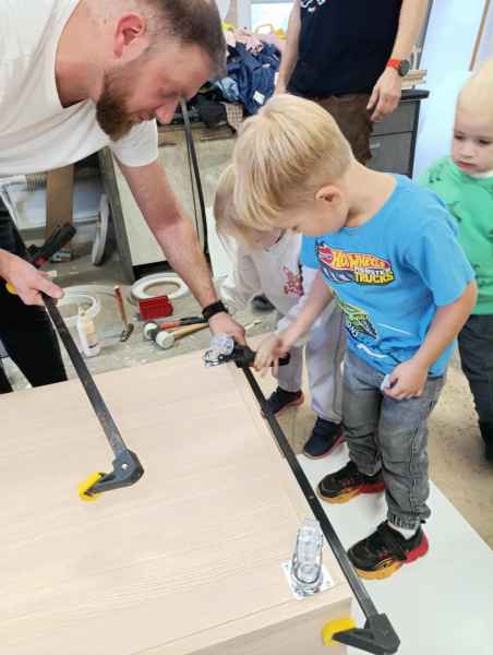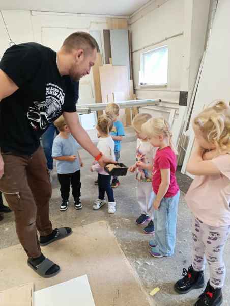 Przedszkolaki odwiedziły stolarnię i miały wyjątkowe zadanie – zbudować skrzynię na zabawki! Pod czujnym okiem Pana Karola i Pana Jarka dzieci pomagały wbijając lamelki, smarując klejem i szlifując drewno. Było dużo śmiechu, pytań i radości z tworzenia czegoś własnymi rękami. Teraz nasza nowa skrzynia stoi w sali i dumnie przechowuje zabawki – wykonana wspólnie, z sercem i uśmiechem! Jeszcze raz serdecznie dziękujemy KB meble Karol Boszke za tak miłe przyjęcie!