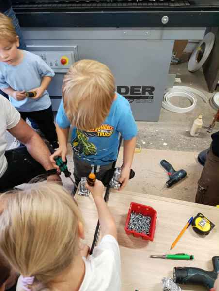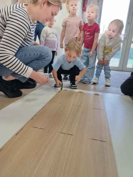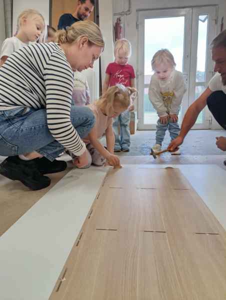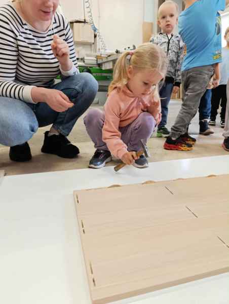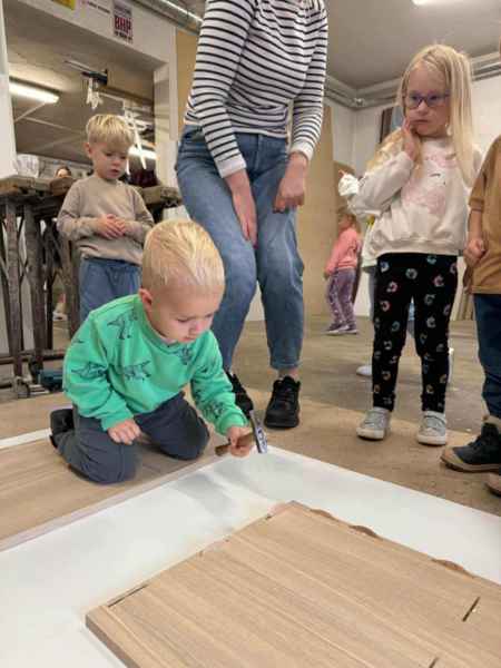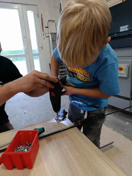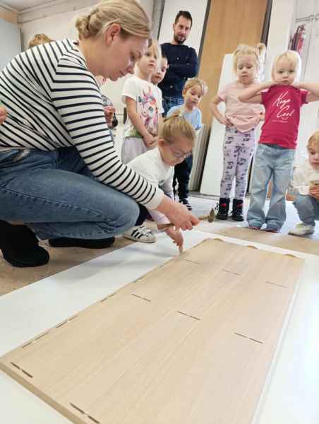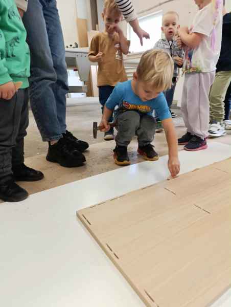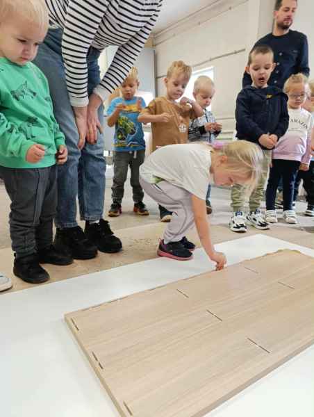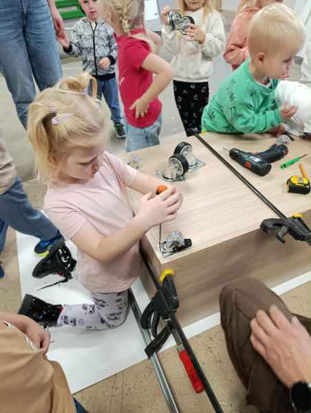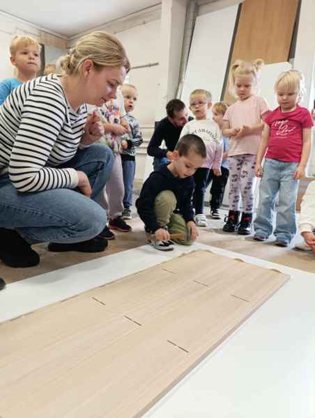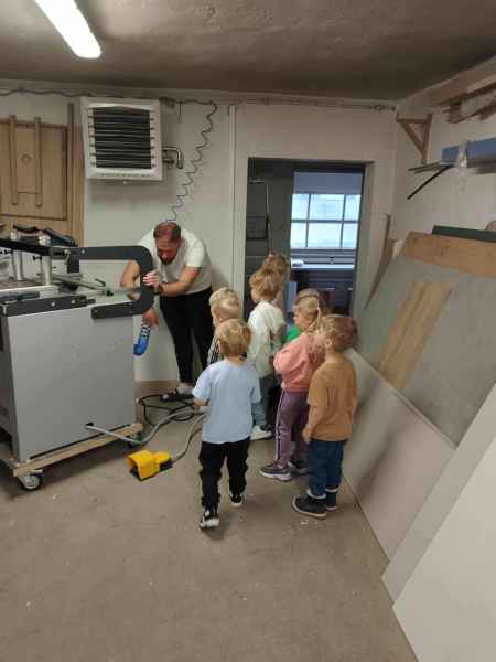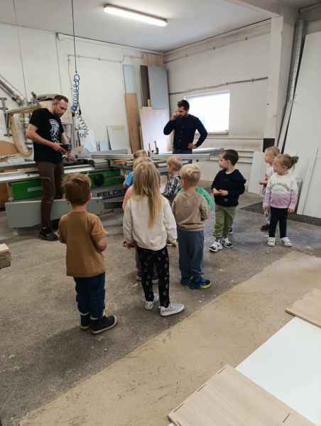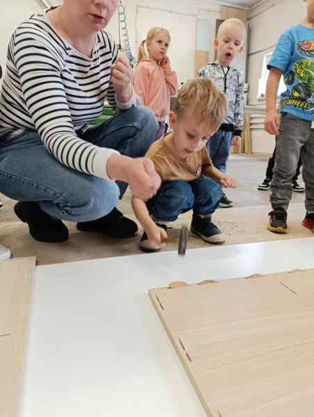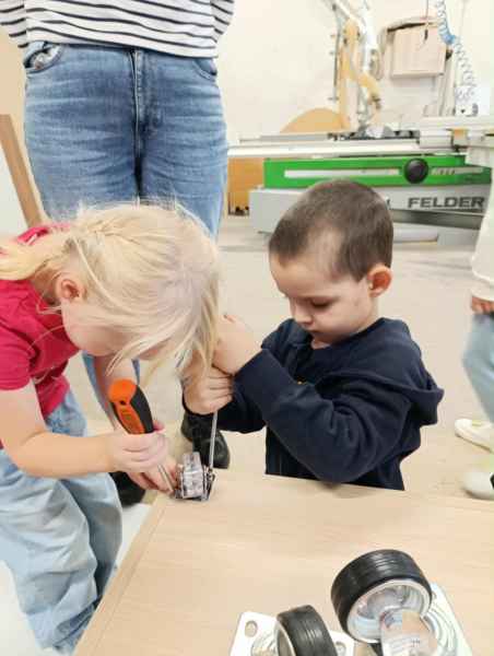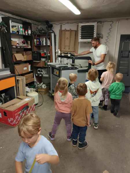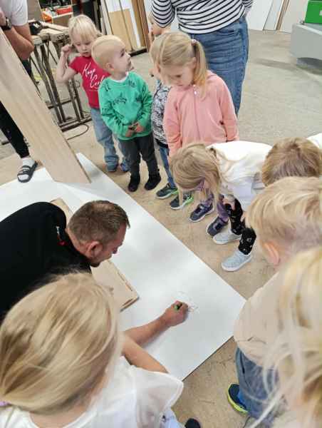 Przedszkolaki odwiedziły stolarnię i miały wyjątkowe zadanie – zbudować skrzynię na zabawki! Pod czujnym okiem Pana Karola i Pana Jarka dzieci pomagały wbijając lamelki, smarując klejem i szlifując drewno. Było dużo śmiechu, pytań i radości z tworzenia czegoś własnymi rękami. Teraz nasza nowa skrzynia stoi w sali i dumnie przechowuje zabawki – wykonana wspólnie, z sercem i uśmiechem! Jeszcze raz serdecznie dziękujemy KB meble Karol Boszke za tak miłe przyjęcie!