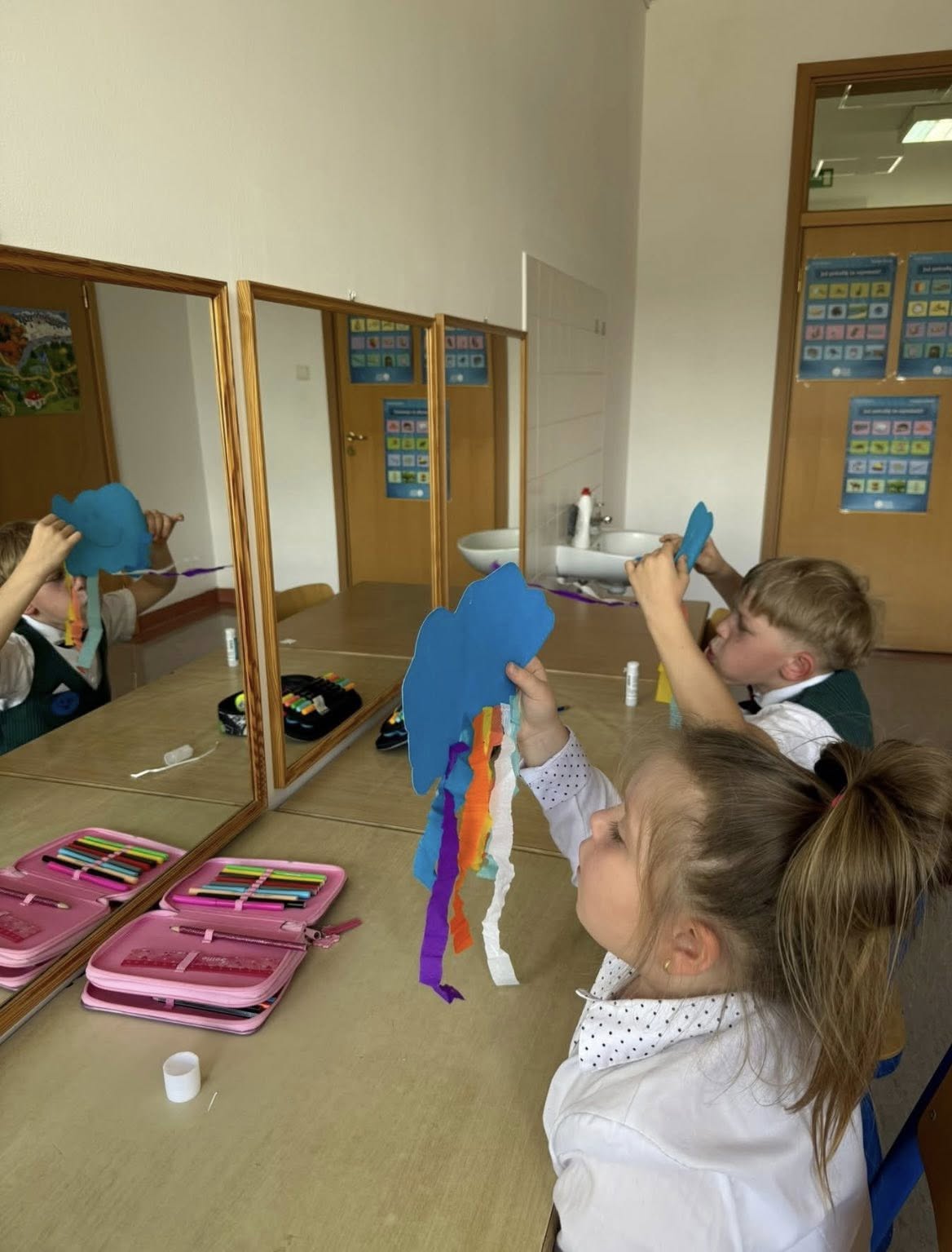 Dzieci miały dziś możliwość malowania farbami przy użyciu pędzli, a także dłoni i stóp. D!zięki temu dzieci miały możliwość poczucia na swojej skórze różnych faktur, konsystencji i temperatur farb, co pobudzało zmysł dotyku. To była wspaniała sensoryczna przygoda!