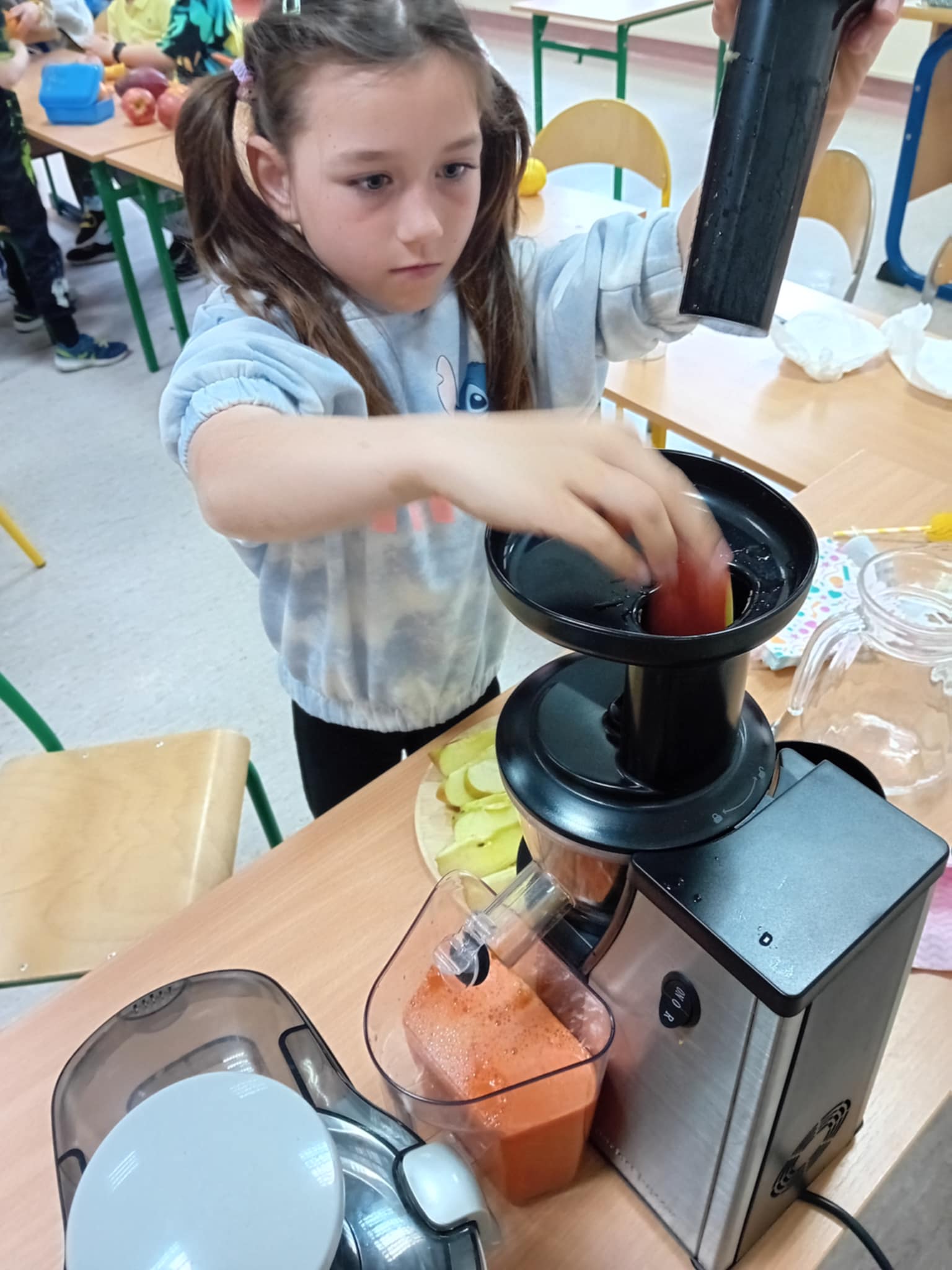 Ib wpadła na pomysł aby wspólnie zrobić pyszne, zdrowe soki. Dzieci podołały, sokowirówki również! Przyniosły tyle owoców że soku wystarczyło by dla całej szkoły! Pomarańczowe, jabłkowe, marchewkowe, mango...wszyscy degustowali soki. Było bardzo słodko ale co najważniejsze zdrowo!