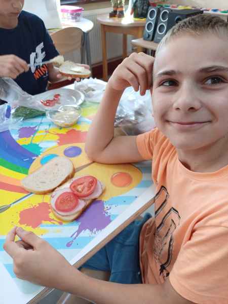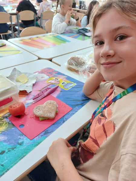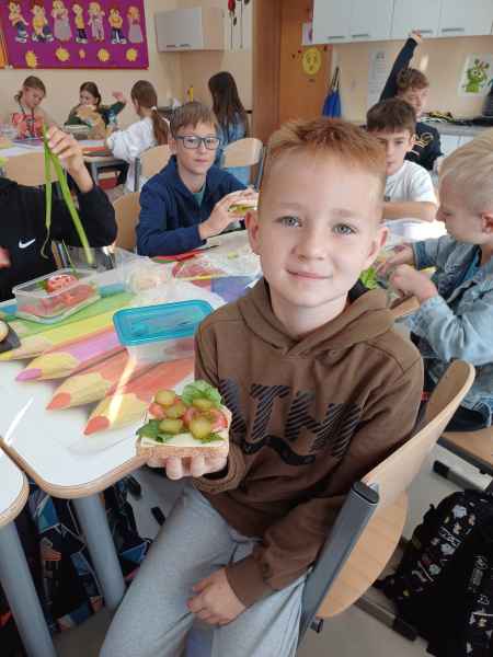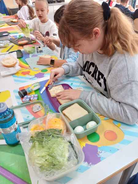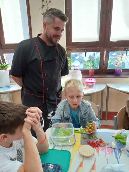 Dzieci pełne zapału, kreatywności i świetnych pomysłów, wykonały tak fantastyczne, zdrowe i smaczne kanapki, że zachwyciły naszego wspaniałego, szkolnego kucharza, pana Mariusza Piwkę. Swoim fachowym, zawodowym okiem ocenił wykonanie kanapek na 6. Był pod wrażeniem pomysłowości klasy 5 g. Przygoda z profesjonalnym kucharzem na pewno była okazją do zdrowego spojrzenia na śniadanie i przyda się w codziennym życiu. Było zdrowo i pysznie.