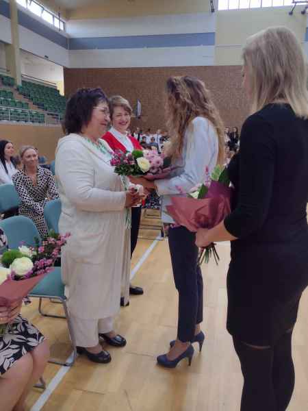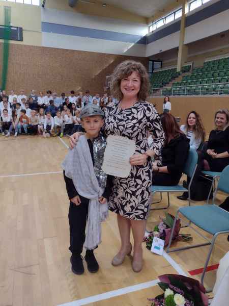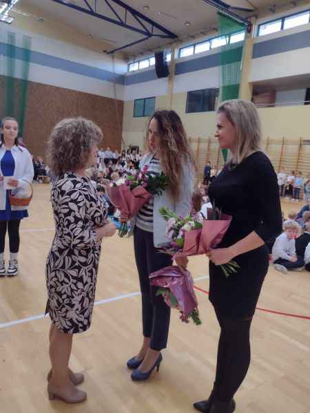 która złożyła życzenia z okazji tej pięknej uroczystości. Na ręce pani dyrektor przewodnicząca Rady Rodziców, Pani Agnieszka Koczwara, złożyła życzenia i wręczyła Dyrekcji szkoły kwiaty. Akademię uświetnił występ uczniów klas III a, III b, pod kierunkiem Pań Magdaleny Makarewicz i Aleksandry Hazuka, podczas którego wszyscy dobrze się bawili. Na koniec uczniowie oraz wszyscy pracownicy szkoły udali się na poczęstunek i słodkości przygotowane przez Rodziców. Było pięknie, było wesoło, było radośnie…