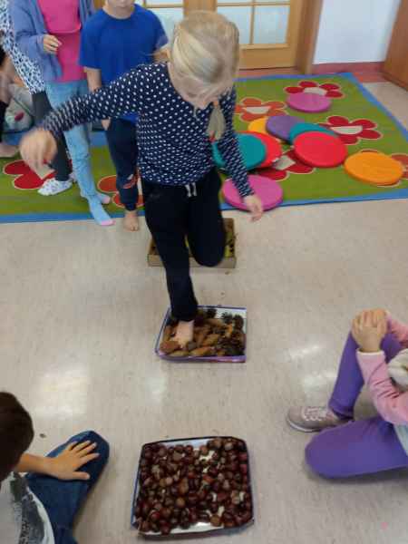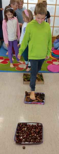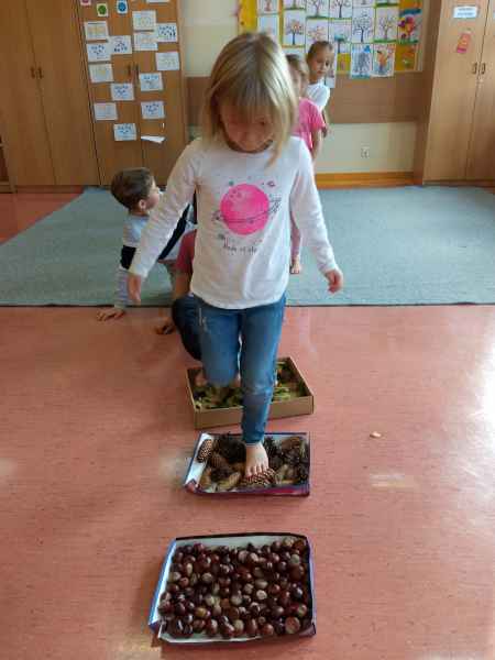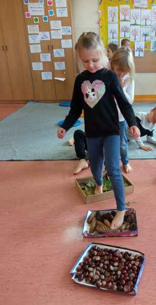 Okazało się, że spacer po naszej ścieżce przyniósł mnóstwo radości i sprawił, że uczniowie nauczyli się nazywać różne faktury. Zaciekawienie dzieci udało się uwiecznić na zdjęciach poniżej.
