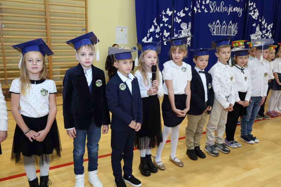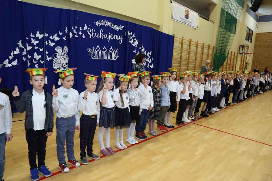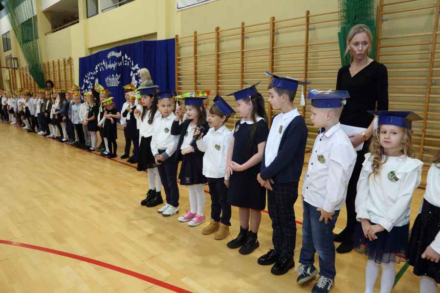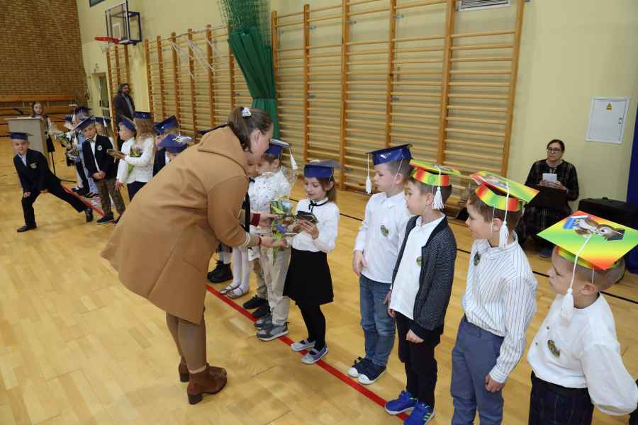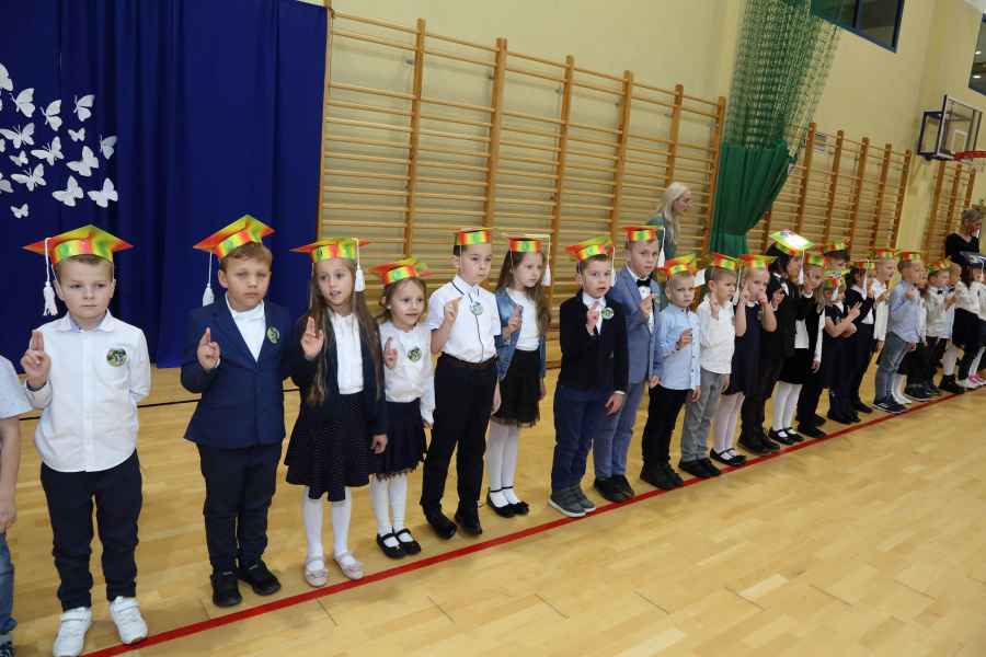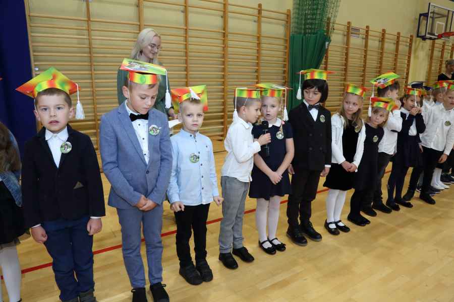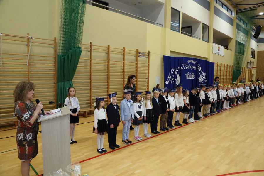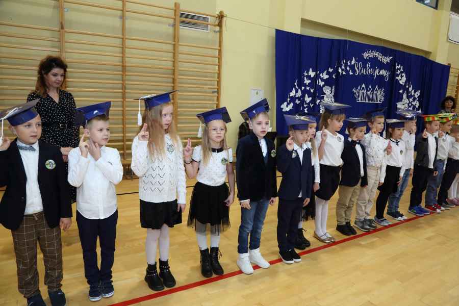 Po ślubowaniu uroczystego pasowania na ucznia pięknym ołówkiem dokonała Dyrektor Szkoły Bożena Brzuzy oraz Panie wicedyrektor Dorota Sychowska i Katarzyna Paczoska. Zgromadzeni goście podziwiali dzieci ubrane w stroje galowe i charakterystyczne birety. Uczniowie pod kierunkiem wychowawców klas zaprezentowali część artystyczną odważnie recytując wiersze, a także śpiewając piosenki. Wszystkie pierwszaki otrzymały pamiątkowe dyplomy oraz drobne upominki ufundowane przez rodziców. Wszystkim pierwszoklasistom gratulujemy i życzymy wielu sukcesów!