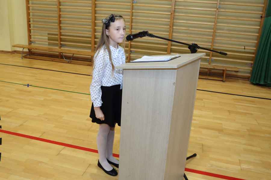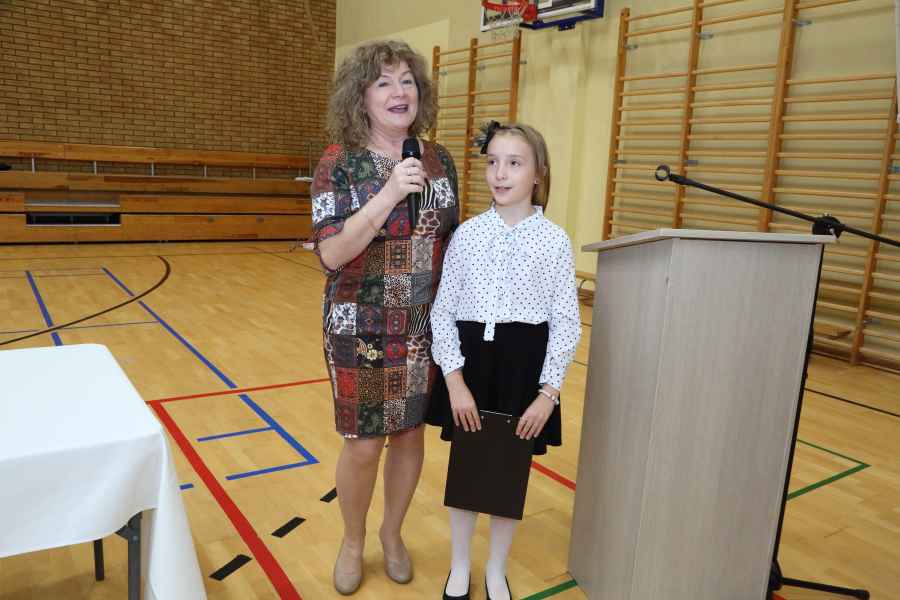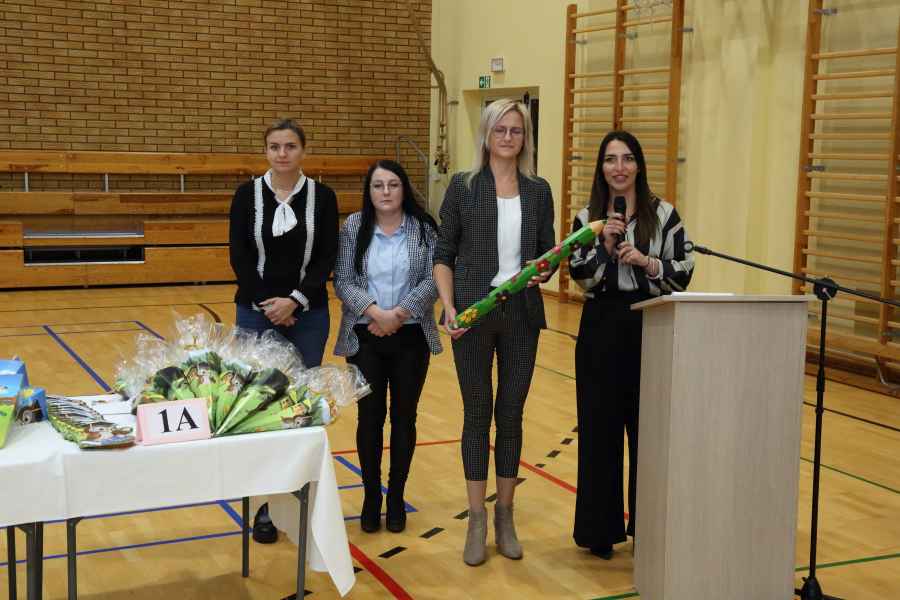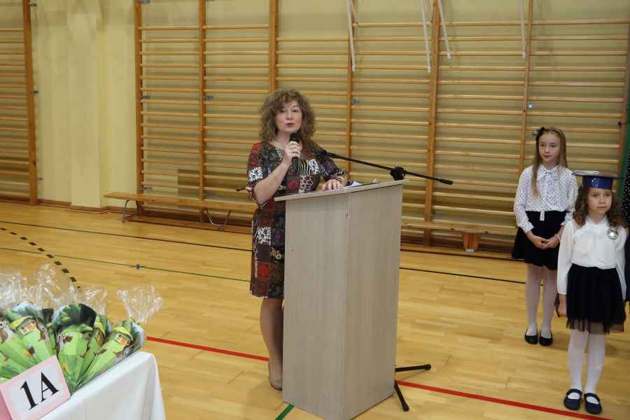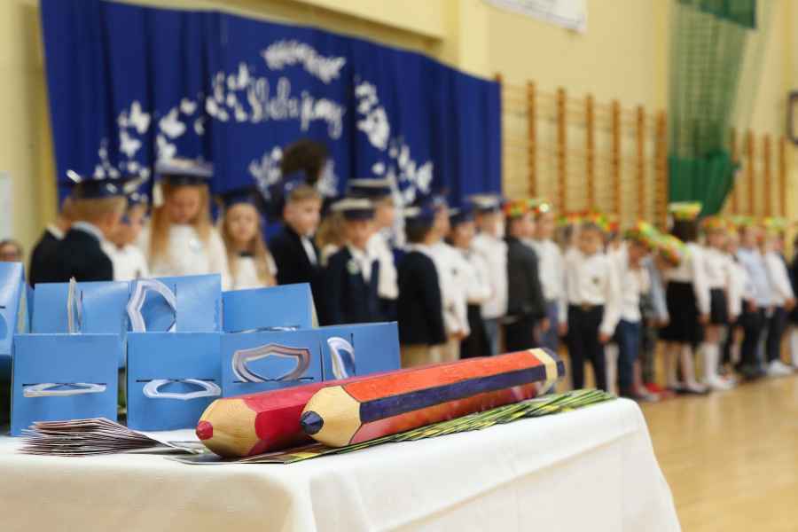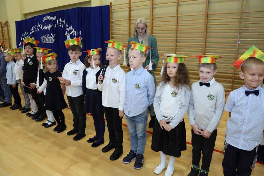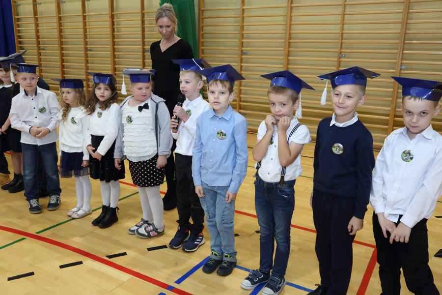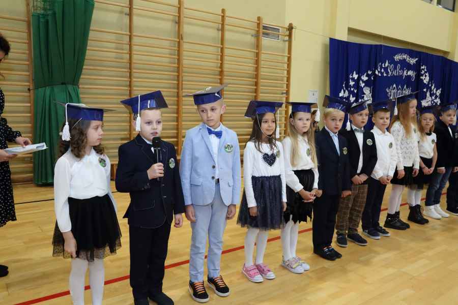 Po ślubowaniu uroczystego pasowania na ucznia pięknym ołówkiem dokonała Dyrektor Szkoły Bożena Brzuzy oraz Panie wicedyrektor Dorota Sychowska i Katarzyna Paczoska. Zgromadzeni goście podziwiali dzieci ubrane w stroje galowe i charakterystyczne birety. Uczniowie pod kierunkiem wychowawców klas zaprezentowali część artystyczną odważnie recytując wiersze, a także śpiewając piosenki. Wszystkie pierwszaki otrzymały pamiątkowe dyplomy oraz drobne upominki ufundowane przez rodziców. Wszystkim pierwszoklasistom gratulujemy i życzymy wielu sukcesów!