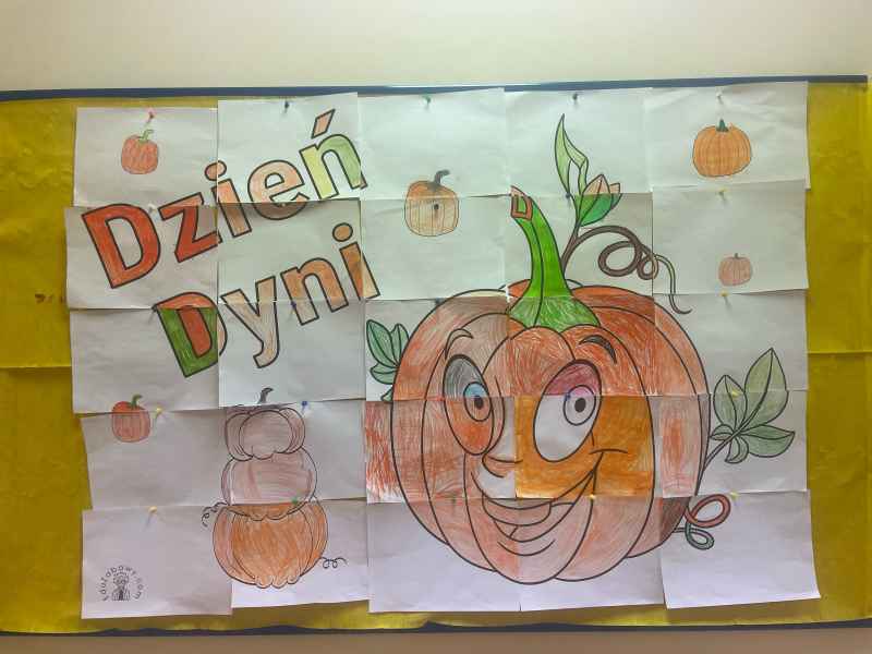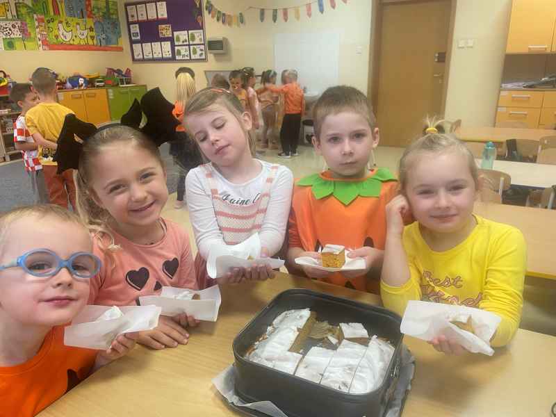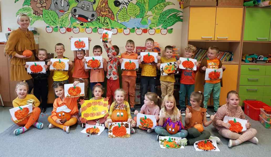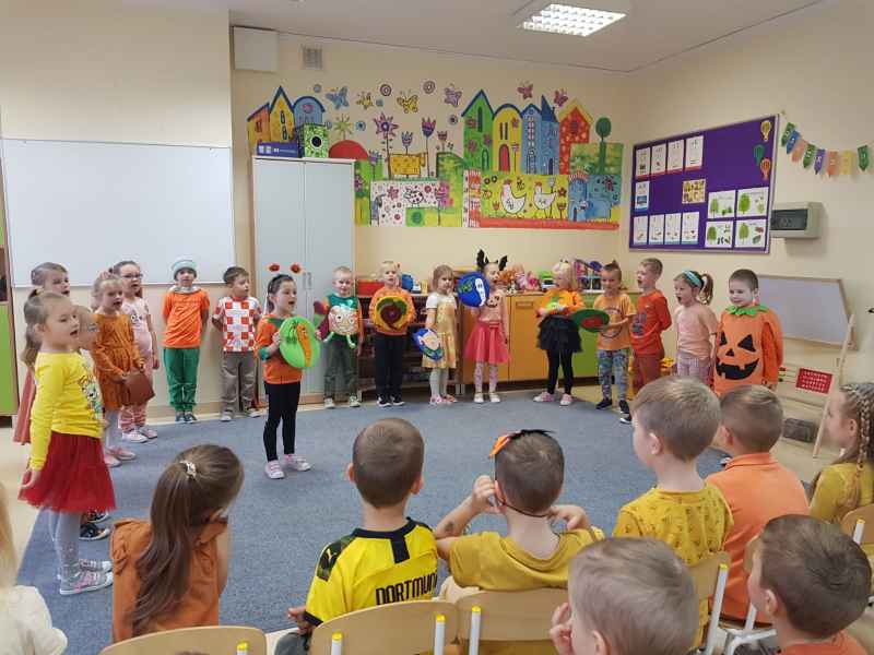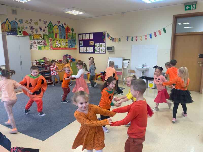 Dzieci przyszły ubrane na pomarańczowo, były dyniowe zabawy, tańce i prace plastyczne raz słodki poczęstunek. Grupa 0b wystawiła dla kolegów z grupy 0a przestawienie o tym, jakim zdrowym i smacznym warzywem jest dynia.