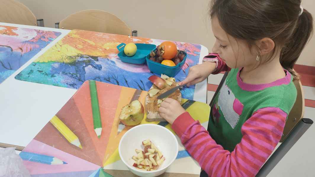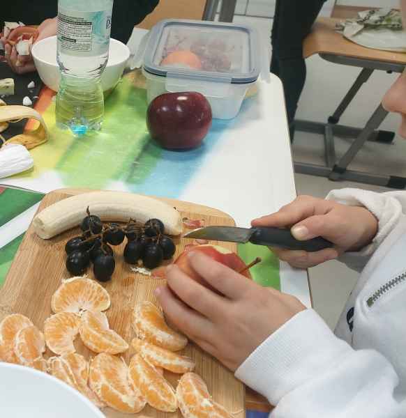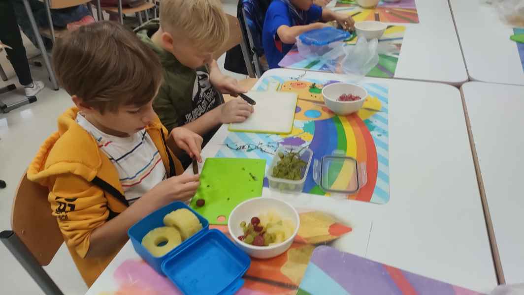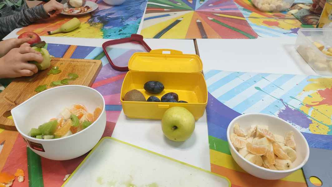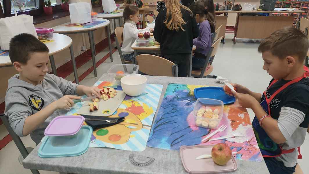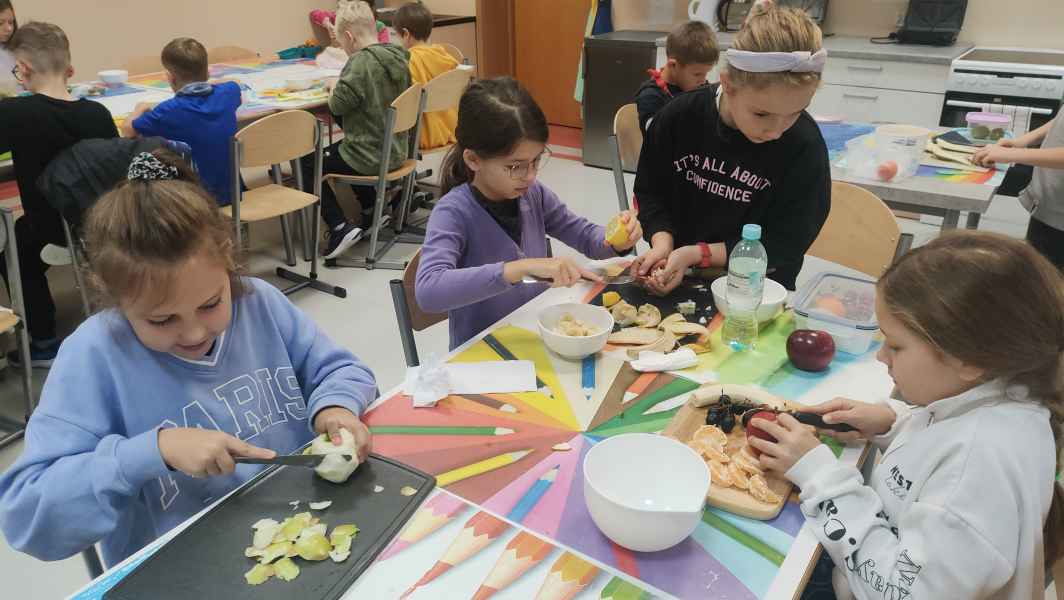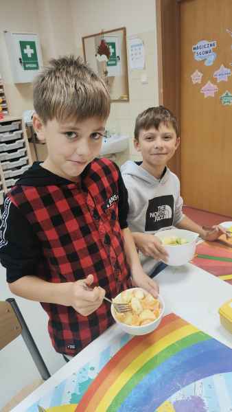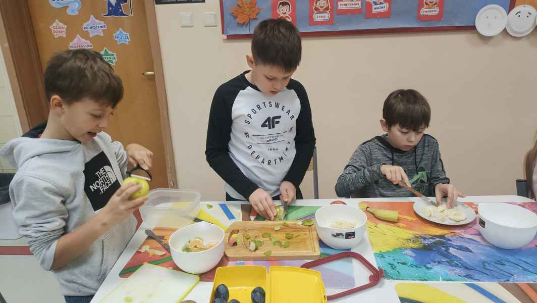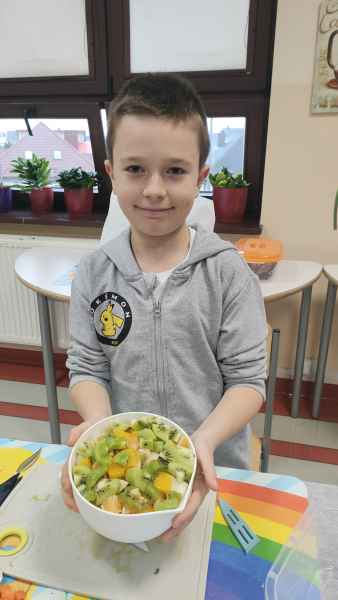 Uczniowie klasy 3 B, wiedząc jak ważne jest zdrowe odżywianie, przygotowali pyszne sałatki owocowe. Każdy z zapałem zabrał się za mycie owoców, krojenie, mieszanie, a na koniec delektowanie zdrową sałatką.