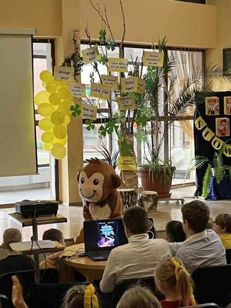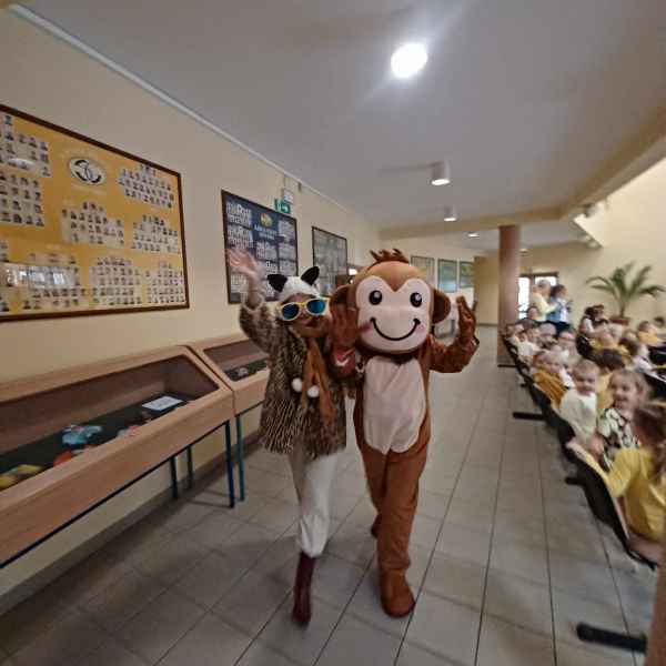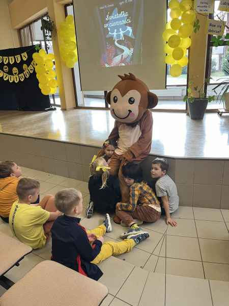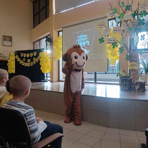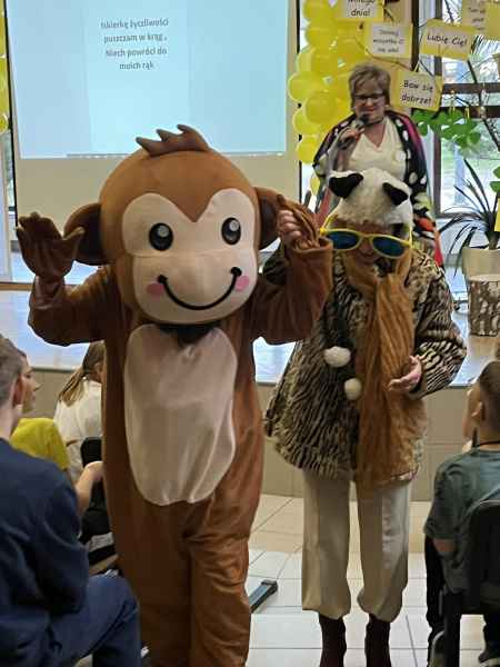 Niespodzianką w programie był gość szczególny, małpka „Życzliwka” wraz ze swoją mamcią,które to zaprosiły uczniów naszej szkoły do tańca iwprowadziłydzieci z klas 0- VIII w krąg uścisków i pozdrowień, wysyłając iskierkę życzliwości.