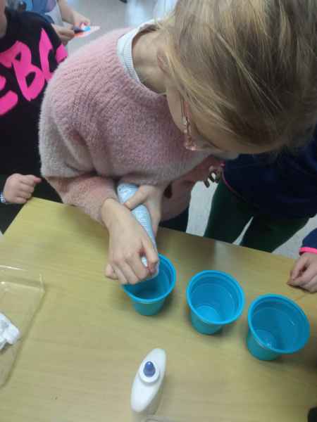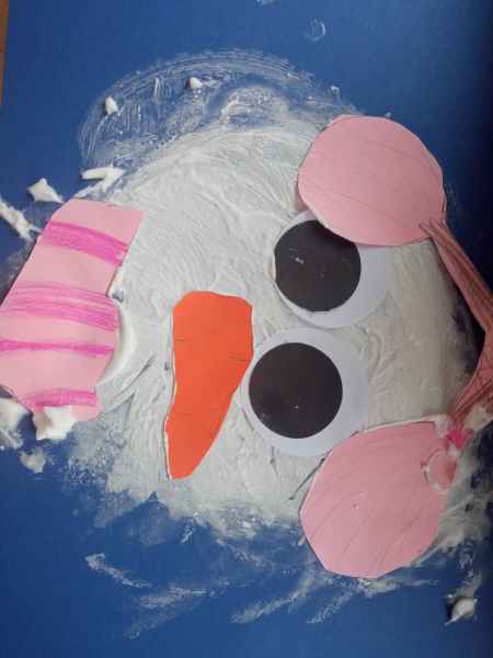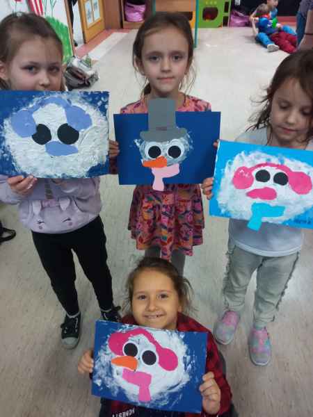Przydały się pędzle, choć formowanie rosnącej farby łatwiejsze było przy pomocy rąk. Nie mogło zabraknąć też nożyczek, bo bałwanki zostały przystrojone w zimowe szale, nauszniki lub cylinder. Oto zimowa zabawa!