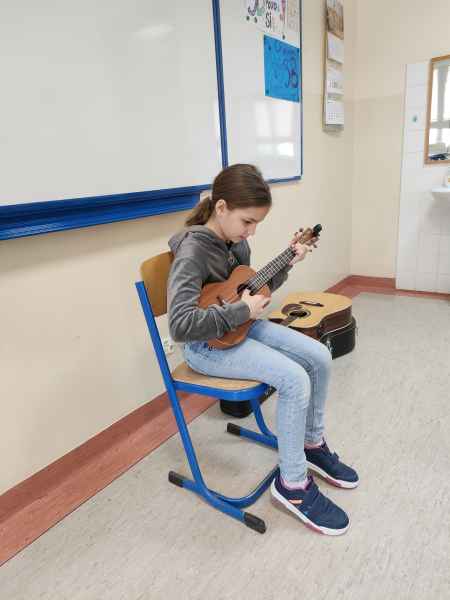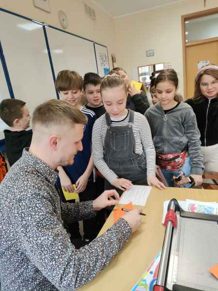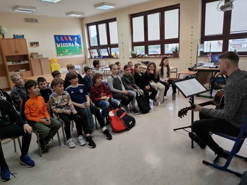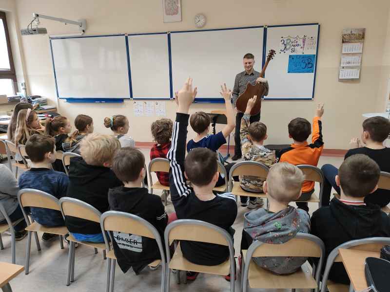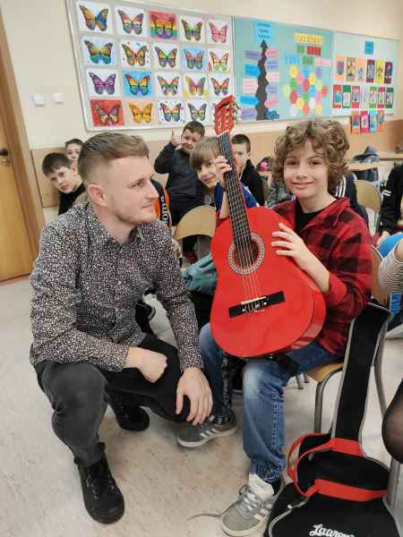 Pierwsze były warsztaty muzyczne. Tego dnia na zajęciach gościliśmy tatę jednego z uczniów, który wprowadził nas w świat gitarowych brzmień i dźwięków. Najpierw nasz gość zapoznał nas z wiedzą teoretyczną dotyczącą rodzajów tego instrumentu i jego budową, a potem przyszedł czas na poznanie „działania” gitary w praktyce. Sala rozbrzmiała więc chórem radosnych dziecięcych głosów, którym na gitarze akompaniował oraz śpiewał Pan Krzysztof. Chętni uczniowie mogli również zaprezentować swoje instrumenty. Pojawiła się więc druga gitara i ukulele – może więc czas pomyśleć o stworzeniu klasowego zespołu muzycznego?! ;) Na koniec spotkania dzieci miały okazję zdobyć autograf od Pana Krzysztofa, do którego ustawiła się długa kolejka.