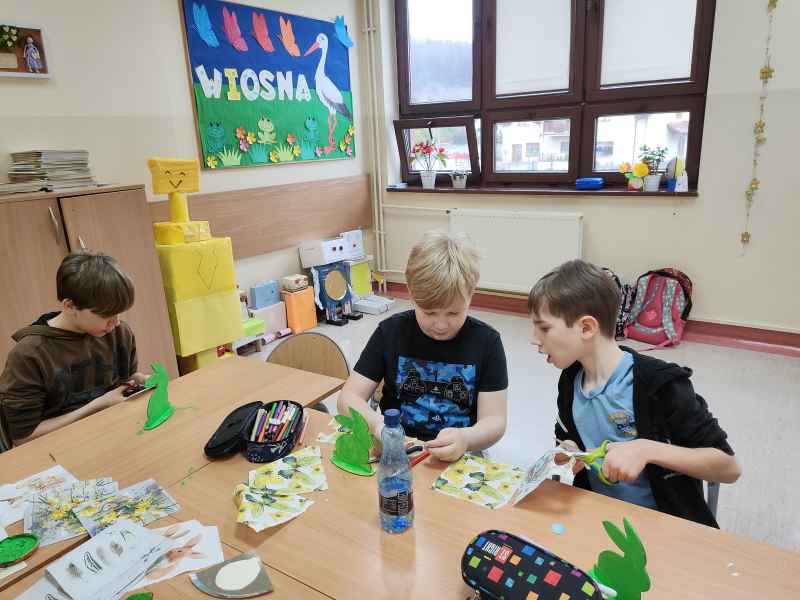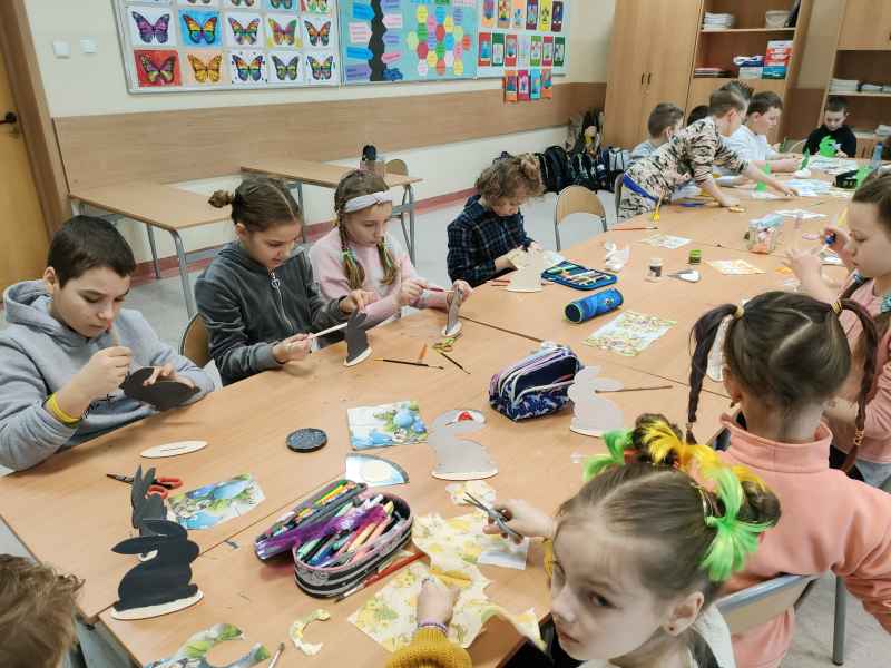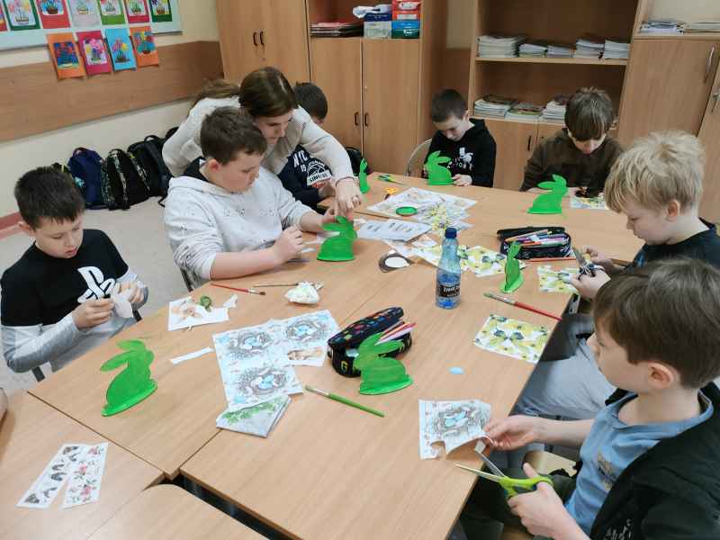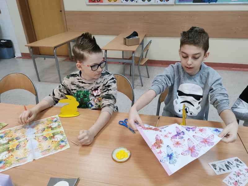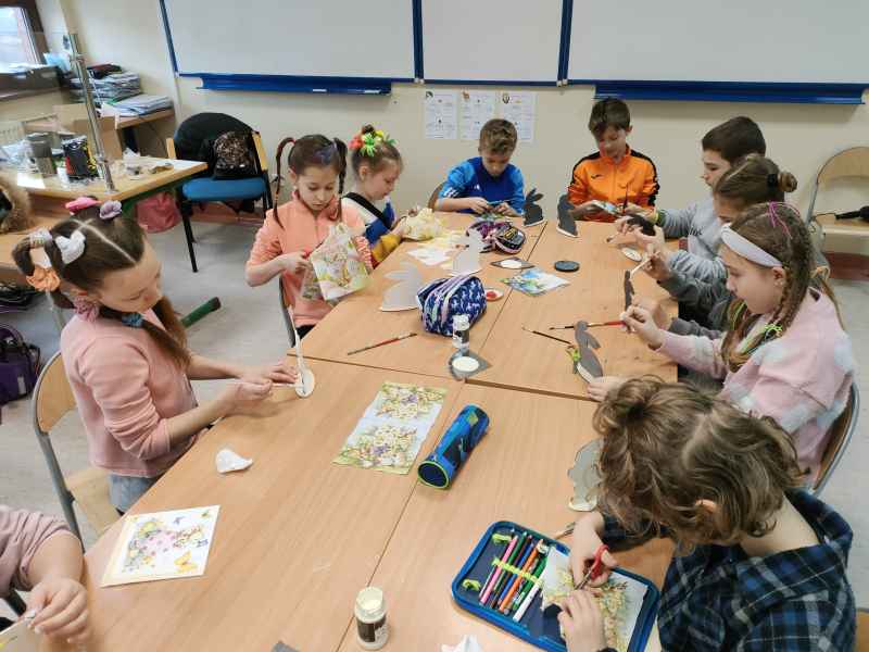 Warsztaty, które odbyły się kolejnego dnia, tym razem odkrywały drzemiące w uczniach zdolności plastyczne. Pani Ola zapoznała dzieci z decoupage. Po krótkim wprowadzeniu, co to jest decoupage – a jest to technika artystyczna, która pozwala zmienić zwykłe przedmioty w niezwykłe dzieła sztuki – dzieci przystąpiły do działania. Wykorzystując proste materiały jak serwetki, specjalny klej i lakier, każdy mógł stworzyć piękne dekoracje do domu lub na prezent. Uczniowie z niezwykłym zapałem i radością przystąpili więc do tworzenia swoich dekoracji. A ponieważ przed nami święta Wielkanocne, dzieci tą metodą ozdabiały drewniane zajączki. Zabawa była przednia. Podczas warsztatów swoją pomocną dłonią służyła Pani Dominika - mama jednego z uczniów, której bardzo dziękujemy za poświęcony czas. Radzie Rodziców natomiast dziękujemy za zasponsorowanie potrzebnych materiałów.