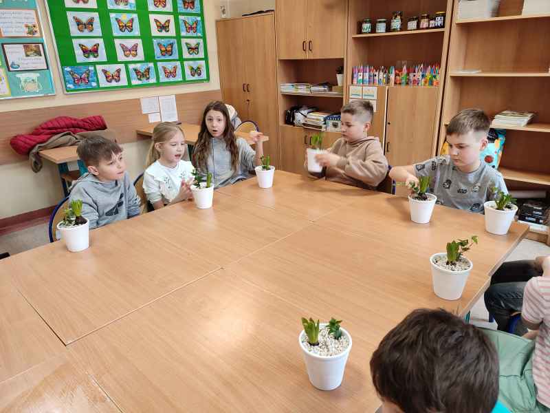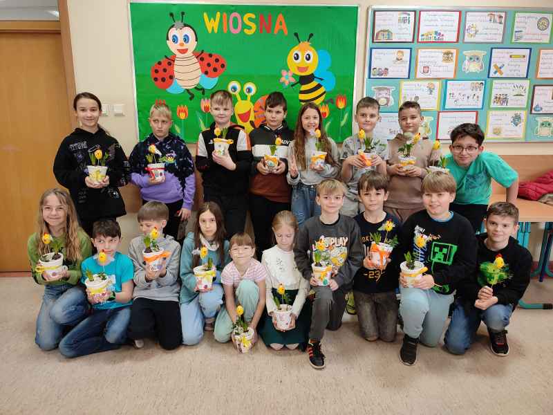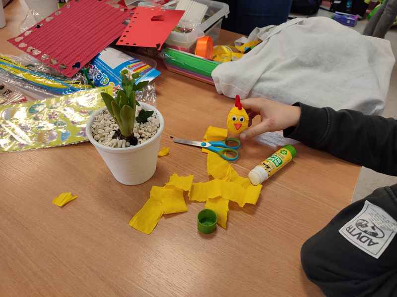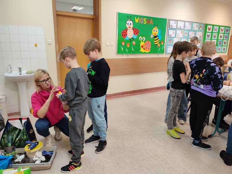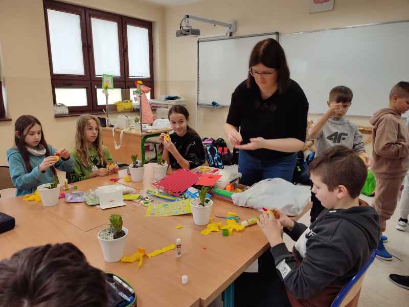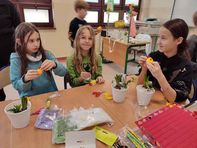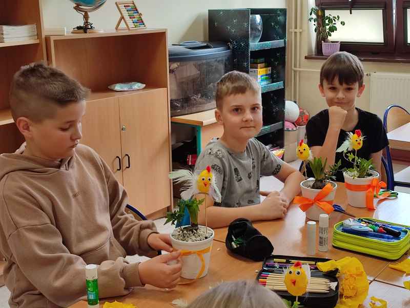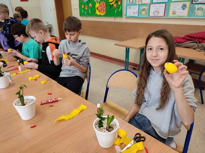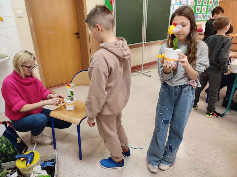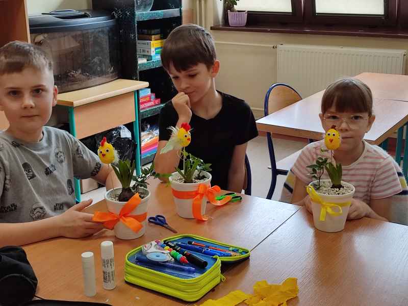 Uczniowie własnoręcznie stworzyli kompozycję z roślin doniczkowych, sadząc je pod czujnym okiem Pań prowadzących. Następne zadanie miało charakter plastyczny i polegało na wykonaniu wielkanocnego kurczaczka, który wzbogacił kompozycję z roślin. Na koniec dzieci ozdabiały jeszcze doniczki kolorowymi wstążeczkami i naklejkami wielkanocnymi. Końcowym efektem działań uczniów były wielkanocne stroiki, których dodatkową zaletą, oprócz walorów artystycznych, jest możliwość wykorzystania także po świętach, ponieważ jedna z posadzonych roślinek jest wieloletnia.