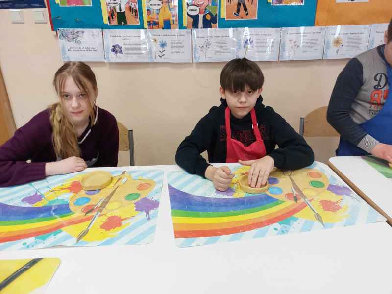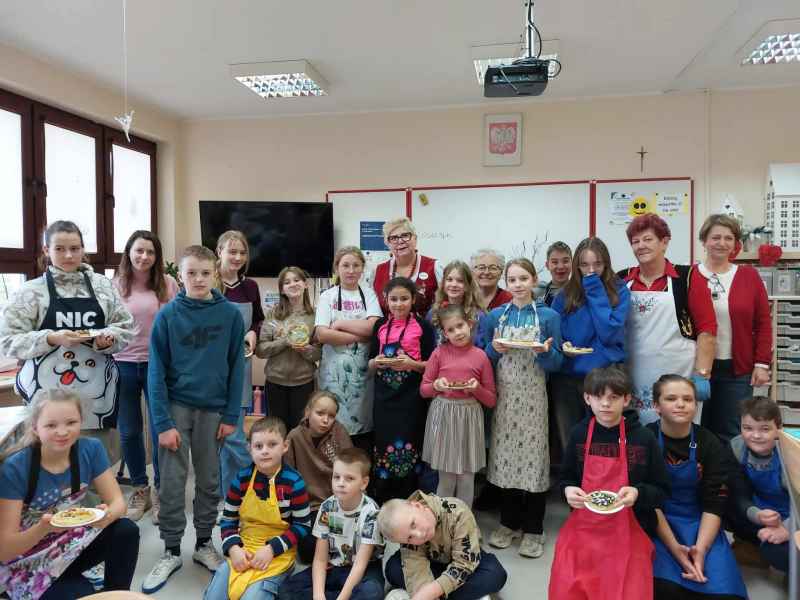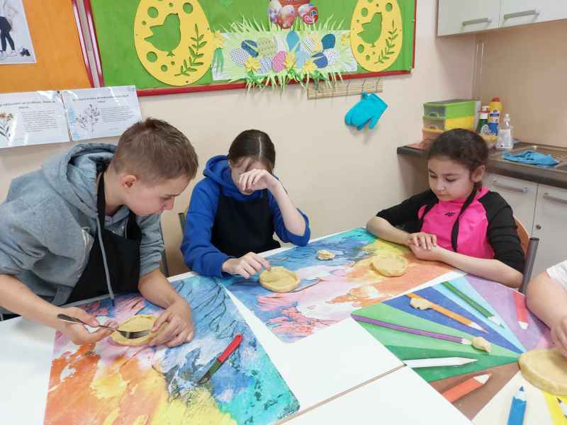 W godzinach popołudniowych w laboratorium zebrało się 11 dzieci, w tym troje z Ukrainy, by rozwałkować schłodzone ciasto, nadać mu kształt elipsy, kurczaka lub zająca i ułożyć na blasze. Uczniom towarzyszyły Panie z Koła Gospodyń Wiejskich w Bolszewie ubrane w tradycyjne kaszubskie stroje ludowe oraz nauczycielki: Katarzyna Paczoska i Hanna Dettlaff.