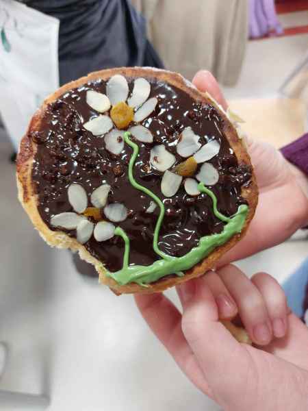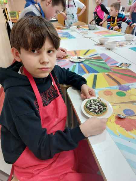 Po upieczeniu i wystygnięciu dzieci przystąpiły do dekoracji mazurków, nakładając wspólnie przygotowaną polewą cytrynową lub kakaową oraz układając na niej różne wzory związane z Wielkanocą. Podczas tych czynności uczestnicy powtarzali słówka kaszubskie i polskie nazywające czynności i produkty, a młodzież z Ukrainy podawała odpowiedniki ukraińskie. Dzieci opowiadały także o tradycyjnych zwyczajach panujących w ich domach przed wojną.