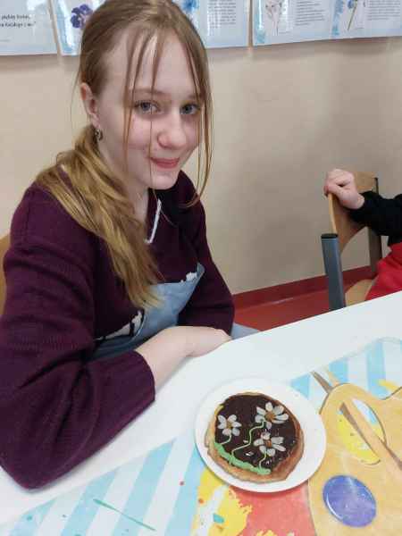 W godzinach rannych chętne uczennice: Emilia Sikorska, Nina Kanabaja i Faustyna Bajończyk wraz z paniami: Magdaleną Makarewicz i Hanną Dettlaff spotkały się o 7.00 , by przygotować kruche ciasto na mazurki. Pani Makarewicz mierzyła lub ważyła składniki: mąkę, sól, żółtka, śmietanę i masło, a dzieci pod kierunkiem pani Dettlaff łączyły je w jedną masę. Następnie zawinęły w folię spożywczą i odstawiły do schłodzenia w lodówce.