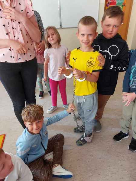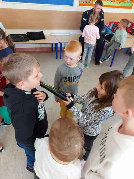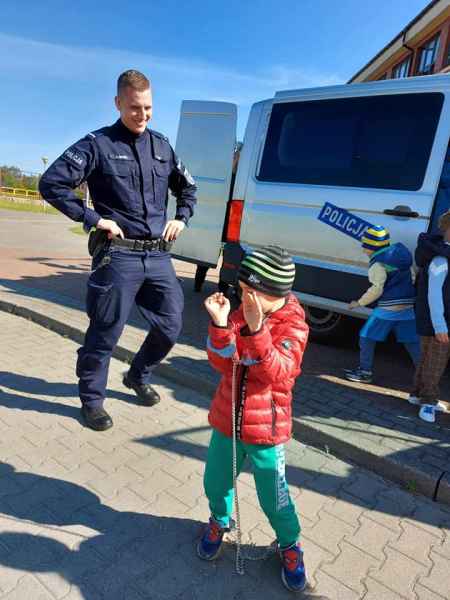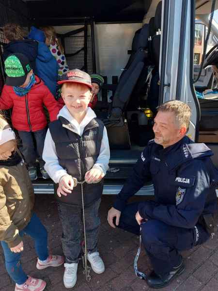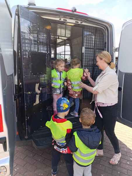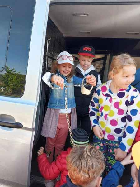 Przedszkolaki mogły zwiedzić auto policyjne, co wywołało niemałe emocje. Zobaczyły też narzędzia i akcesoria, które pomagają funkcjonariuszom w codziennej pracy. Największe zainteresowanie budziły oczywiście kajdanki, do których założenia ustawiała się dłuuuuuga kolejka. Wykrywacz metalu również zrobił furorę wśród dzieci.
