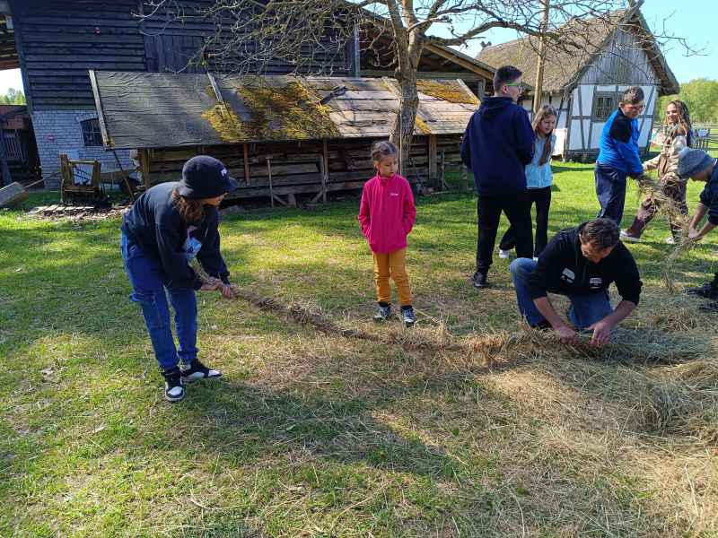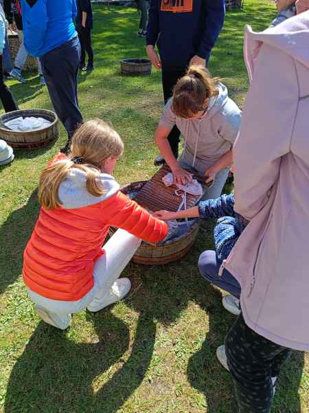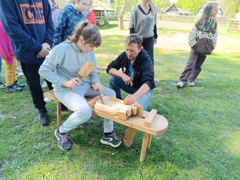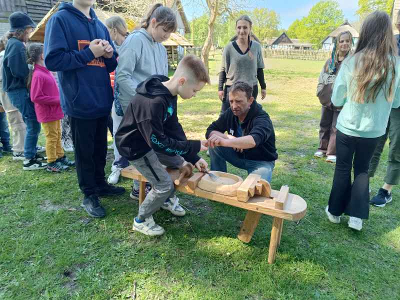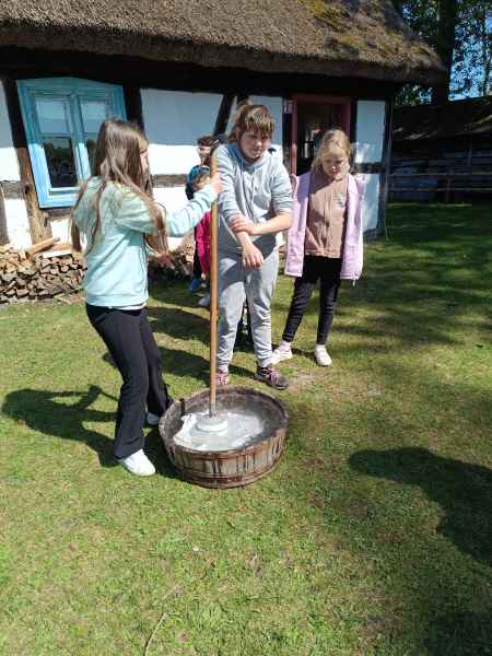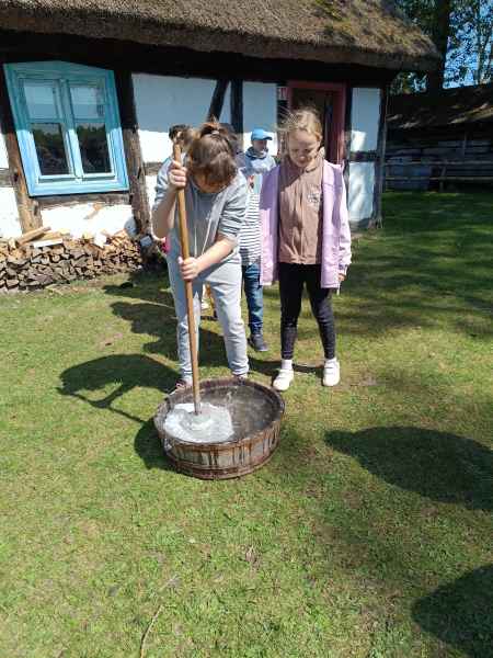 Celem zajęć było przybliżenie kuchni dawnych Słowian. Zadaniem uczniów było przygotowanie posiłku, na który składał się chleb pieczony w tradycyjnym piecu chlebowym, własnoręcznie ubijane w kierzance masło, zupa kartoflanka oraz upieczone na kuchni wafle. Druga grupa zrealizowała zajęcia pt.: „Codzienne zajęcia Słowińców”. Ta grupa przygotowała torf na opał, dłubała klumpy dla konia, piłowała drewno, kręciła powrozy, prała za pomocą tary i dzwonu. Podczas zwiedzania skansenu uczniowie mogli zobaczyć jak dawniej mieszkało się na wsi, jak wyglądały zagrody, domy. Dowiedzieli się też, że życie w dawnym czasach nie było łatwe a praca zajmowała Słowińcom całe dnie. Na zakończenie wycieczki odbył się spacer w Słowiańskim Parku Narodowym gdzie zobaczyliśmy Wydmę Czołpińską.
