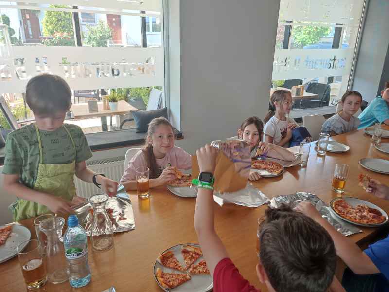 odpowiednio je rozwałkowywać i układać w specjalnej formie - co wbrew pozorom wcale nie jest takie proste. następnie uczniowie wybierali i układali na cieście dodatki. Tak przygotowane pizze tarfiły do specjalnego pieca, a po wypieczeniu na stoły. I tu rozpoczęła się najprzyjemniejsza część warsztatów, czyli degustacja. Pizza smakowała jeszcze bardziej niż zwykle, bo była przygotowana samodzielnie.