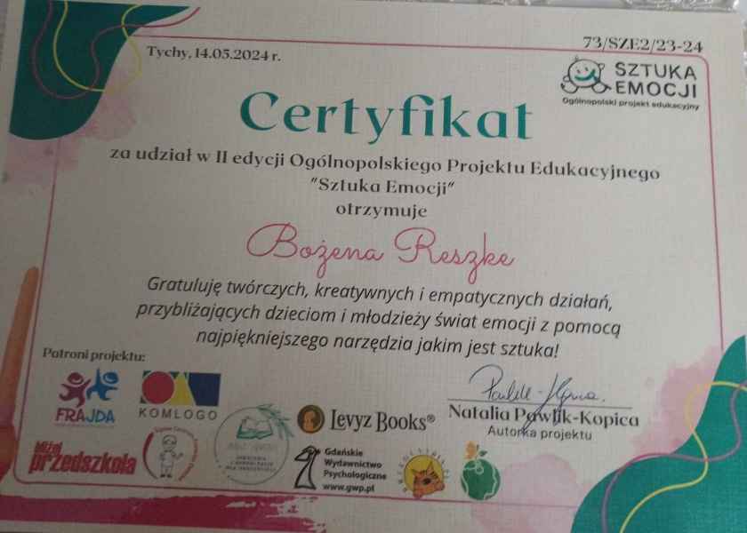 Mamy przyjemność poinformować, że zakończyliśmy udział w Ogólnopolskim Projekcie Edukacyjnym „Sztuka Emocji”, którego głównym celem było skierowanie uwagi i działań nauczyciela oraz uczniów klasy 7d w obszar emocji, wykorzystując do tego sztukę pod jej wszelakimi postaciami. Nauczyciel – Bożena Reszke w tym projekcie stał się przewodnikiem ucznia po świecie emocji,