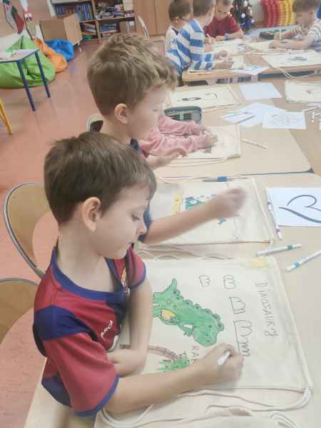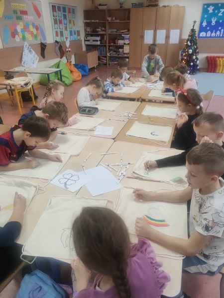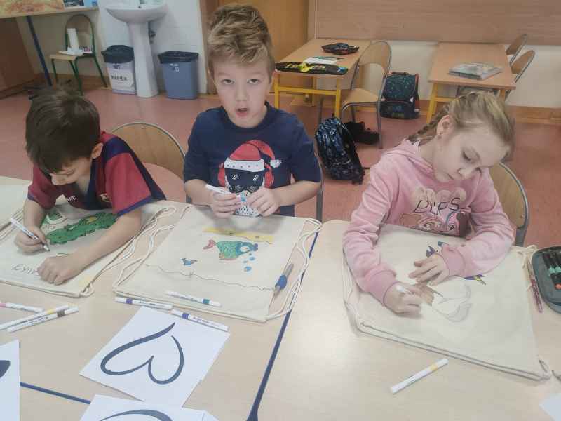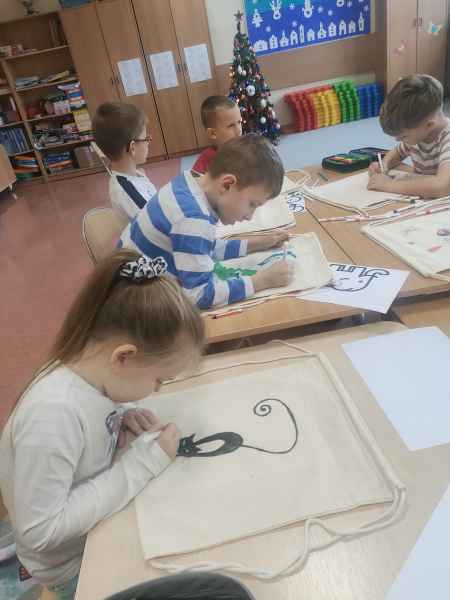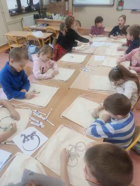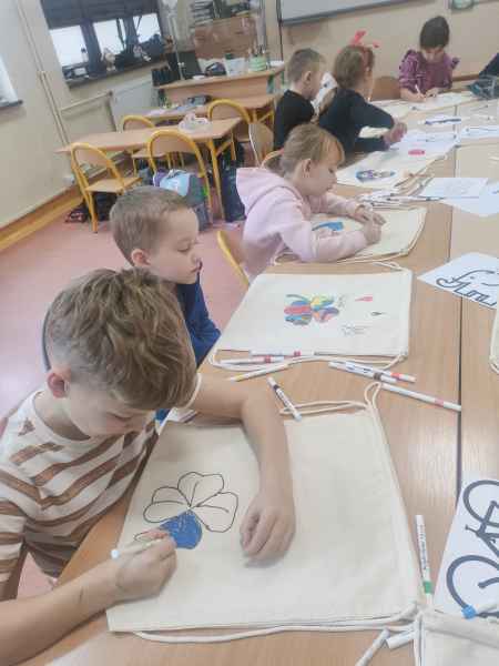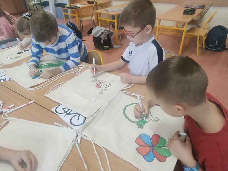 Uczniowie z klasy 1A mieli okazję rozwijać swoją kreatywność podczas warsztatów ozdabiania bawełnianych worków. Powstały przepiękne, kolorowe rysunki, dzięki którym każdy worek nabrał indywidualnego charakteru. Ta miła zabawa była możliwa dzięki ufundowaniu materiałów przez Radę Rodziców, w stronę której kierujemy serdeczne podziękowania.